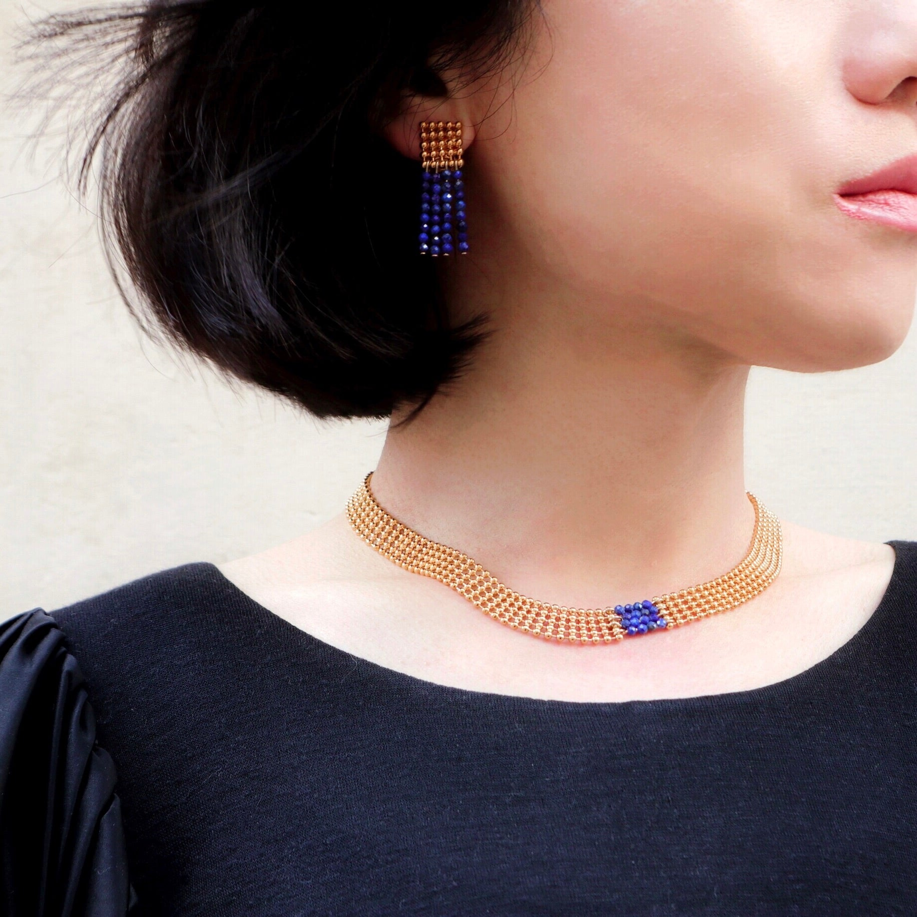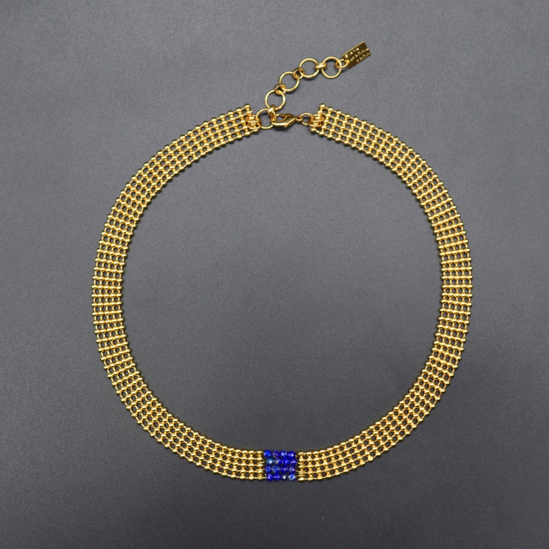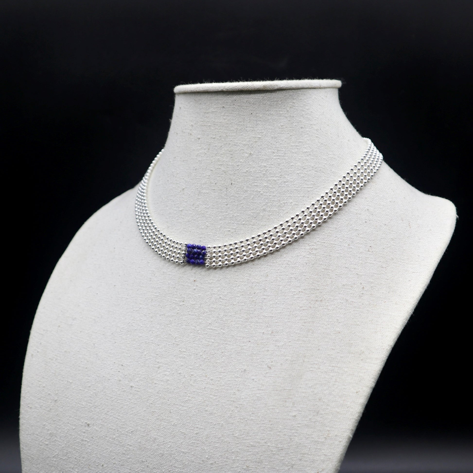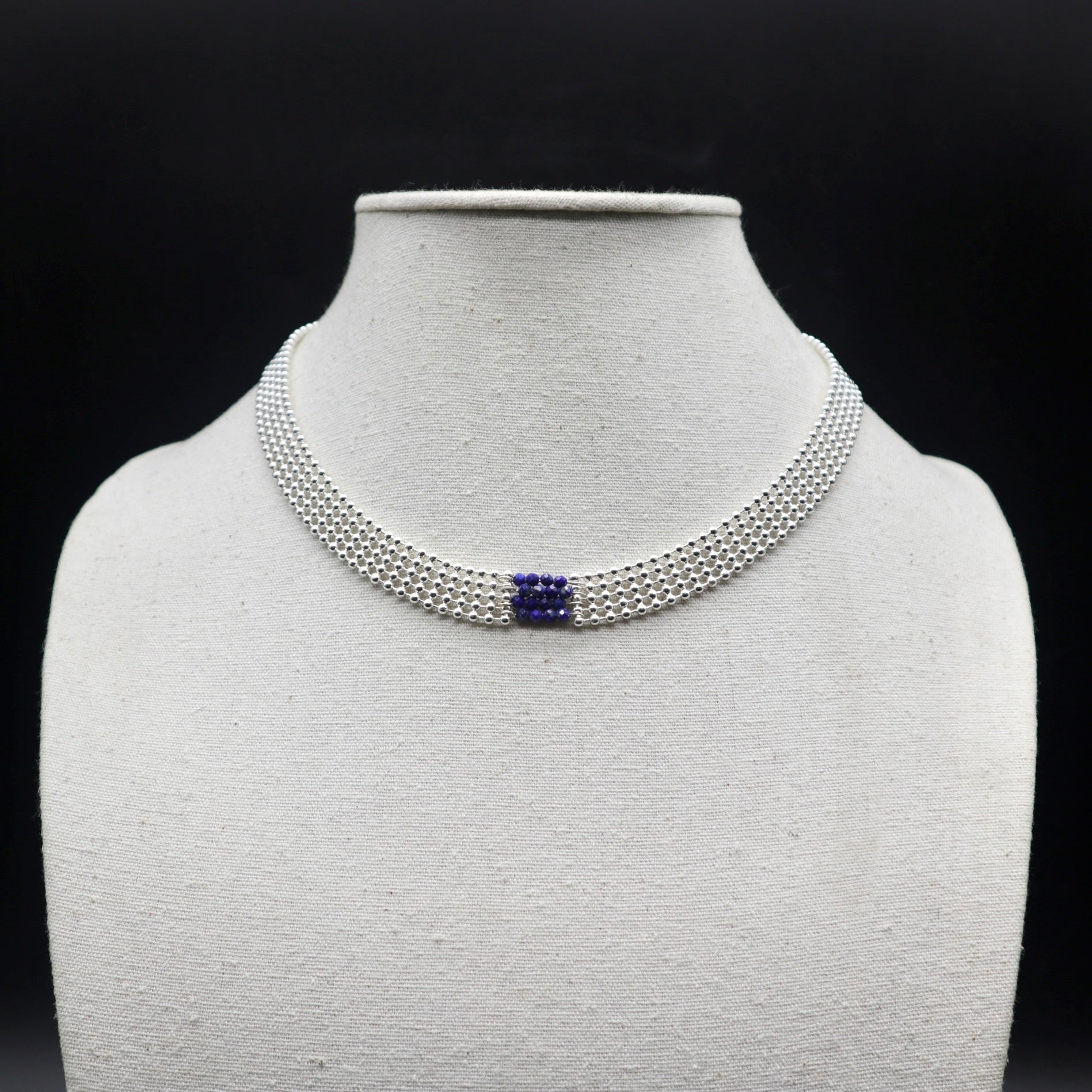 Les perles facettées en lapis-lazuli naturel de grade A brillent au centre du collier.
