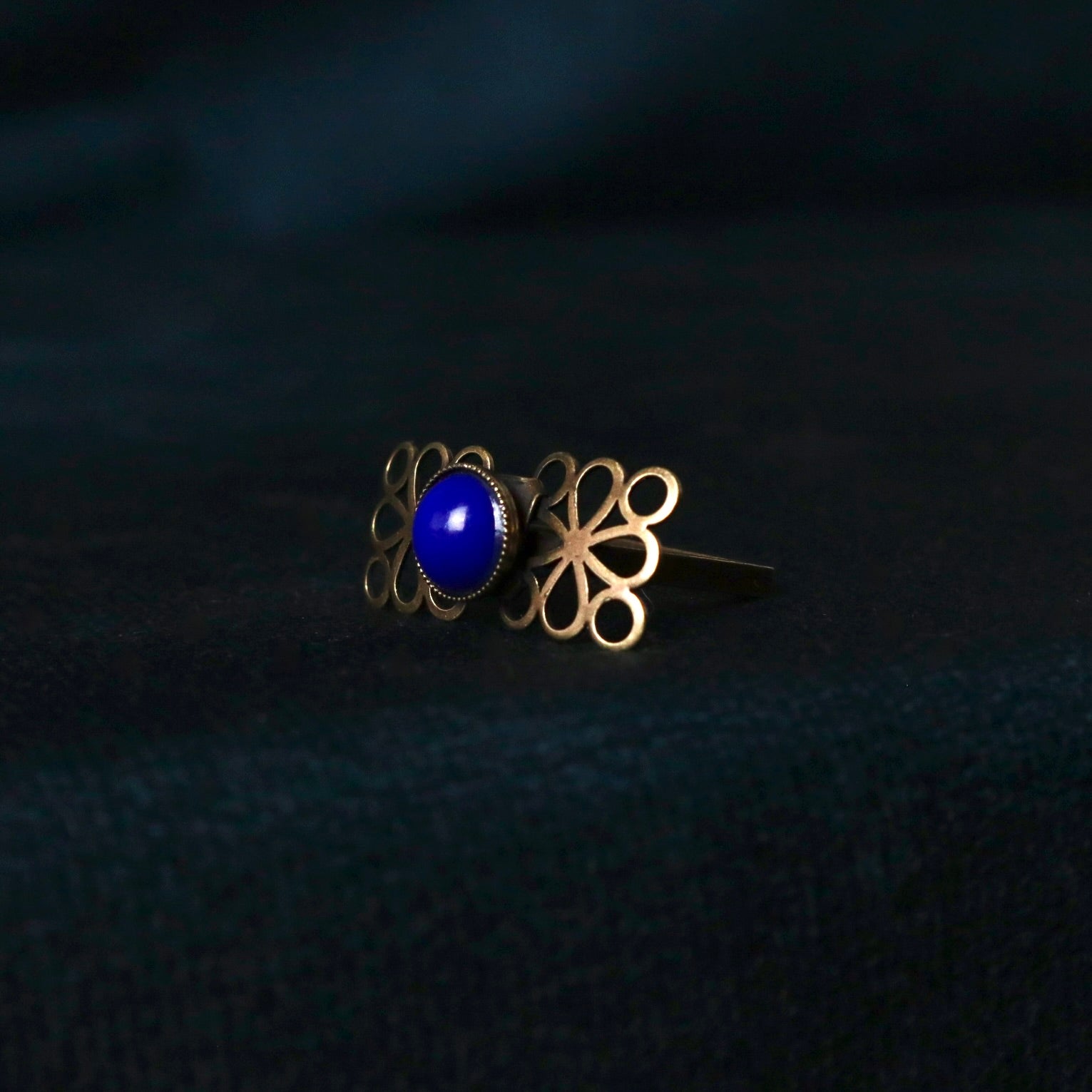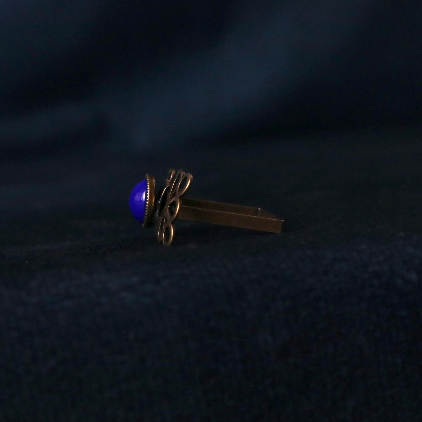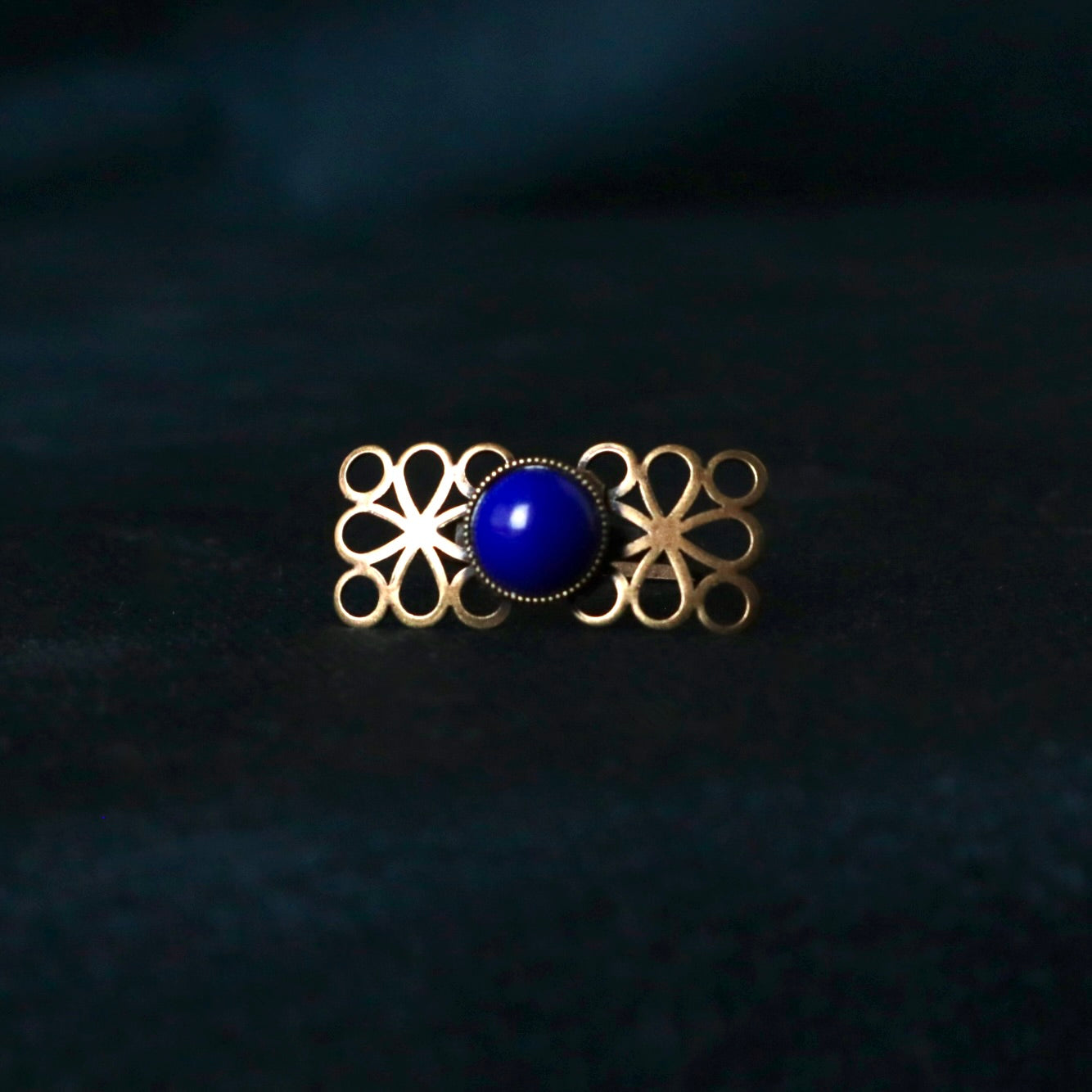 Le cabochon bleu marine rappelant le lapis lazuli est du Swarovski vintage.