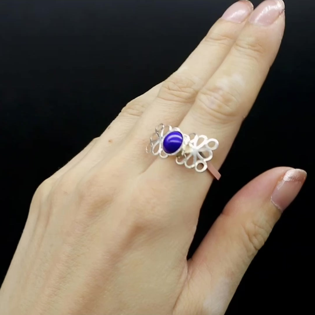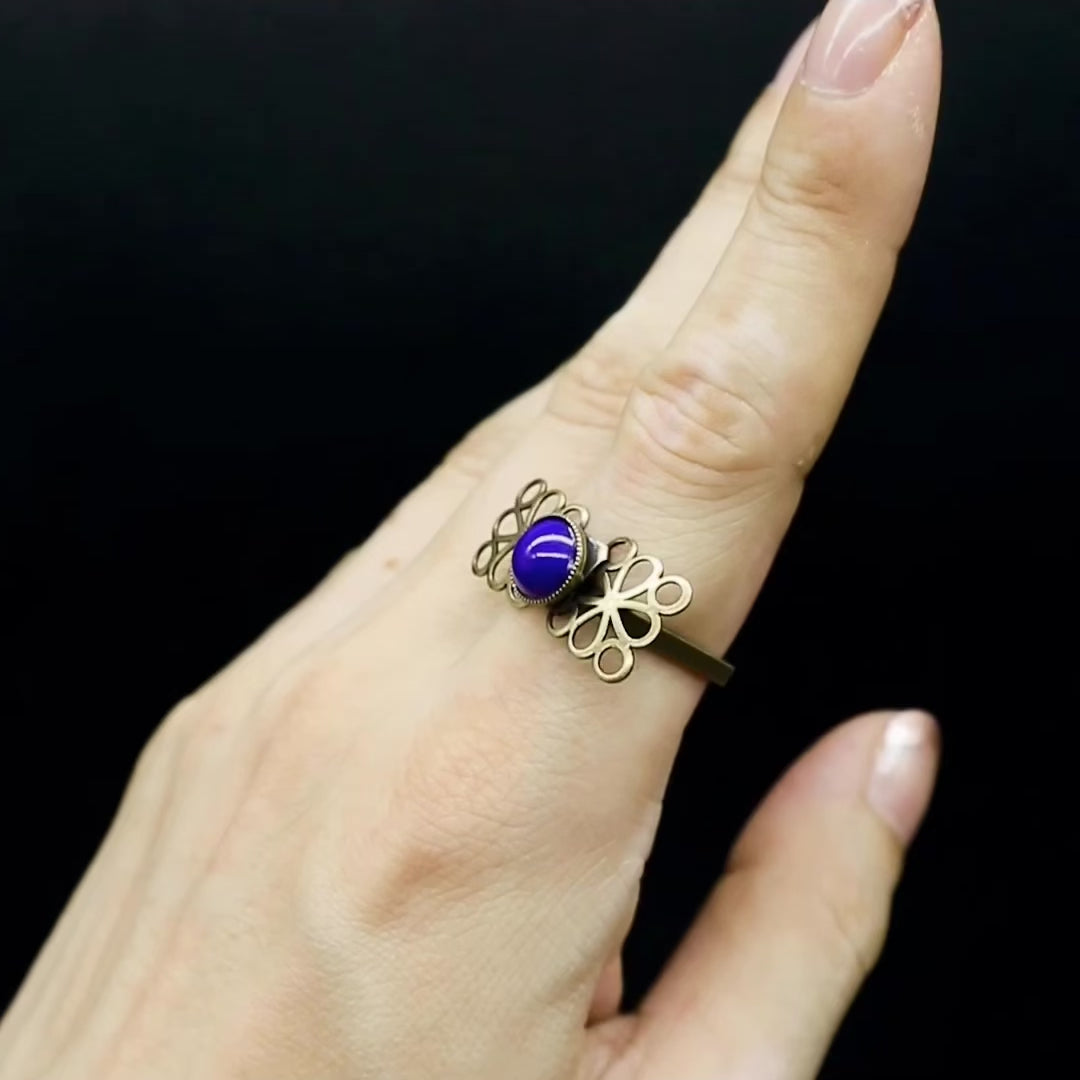 Combinaison harmonieuse du cabochon au centre de la bague et des pièces en métal.