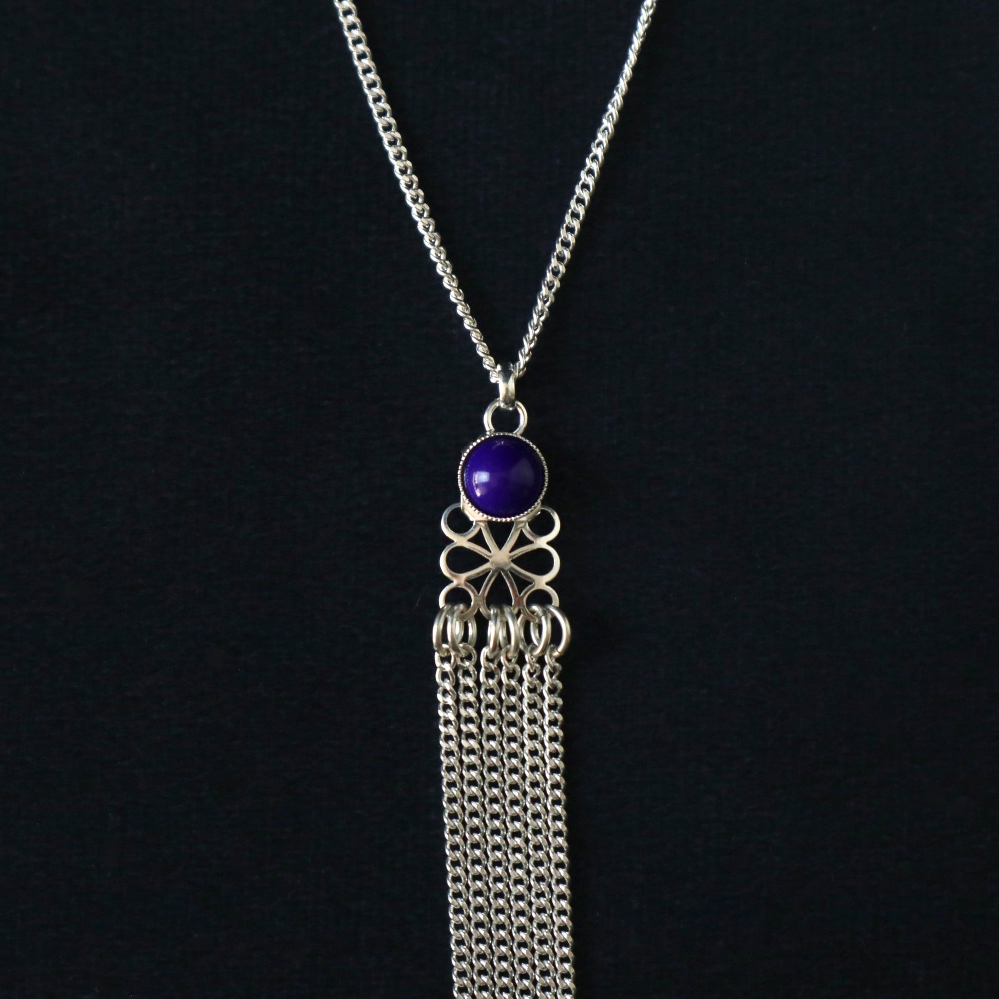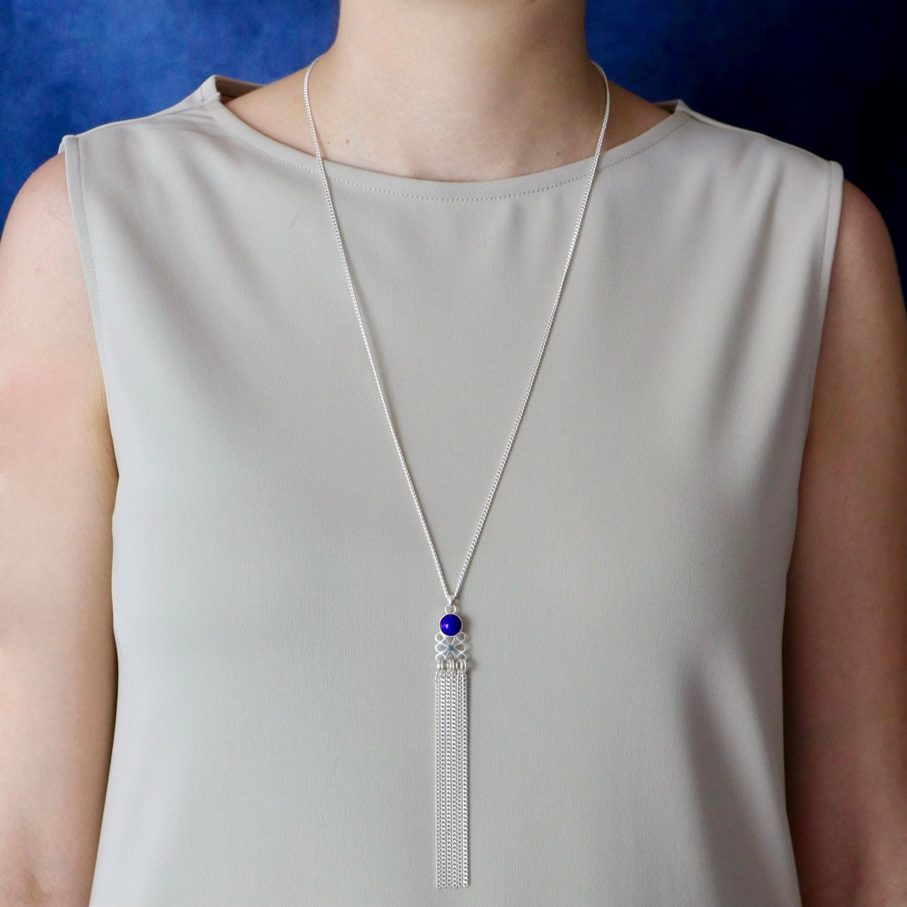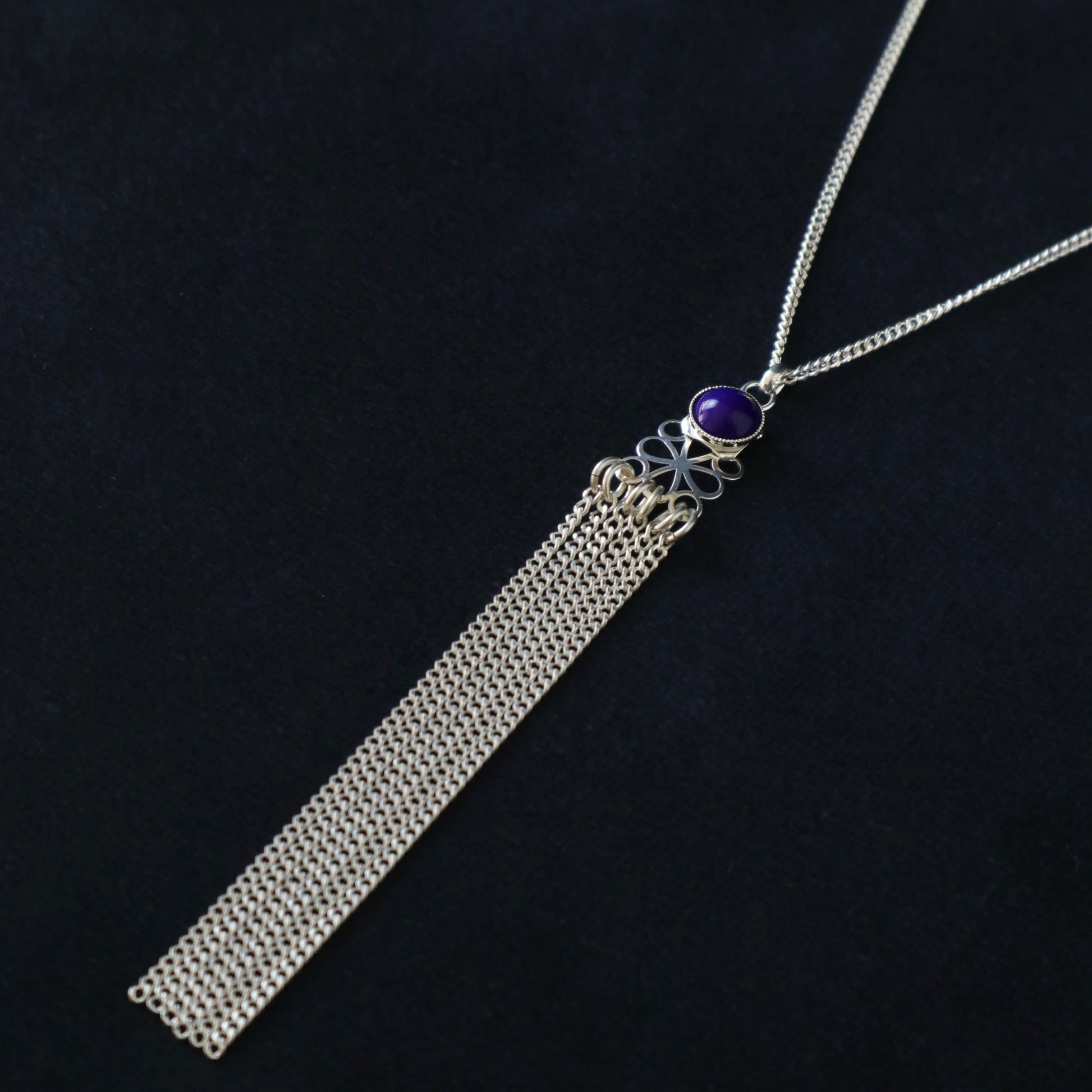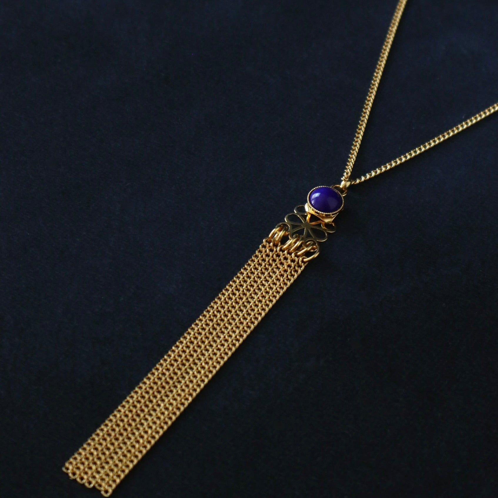 Un sautoir de type pendentif avec une longue frange qui se balance avec élégance et peut être porté pour sortir ou au quotidien.