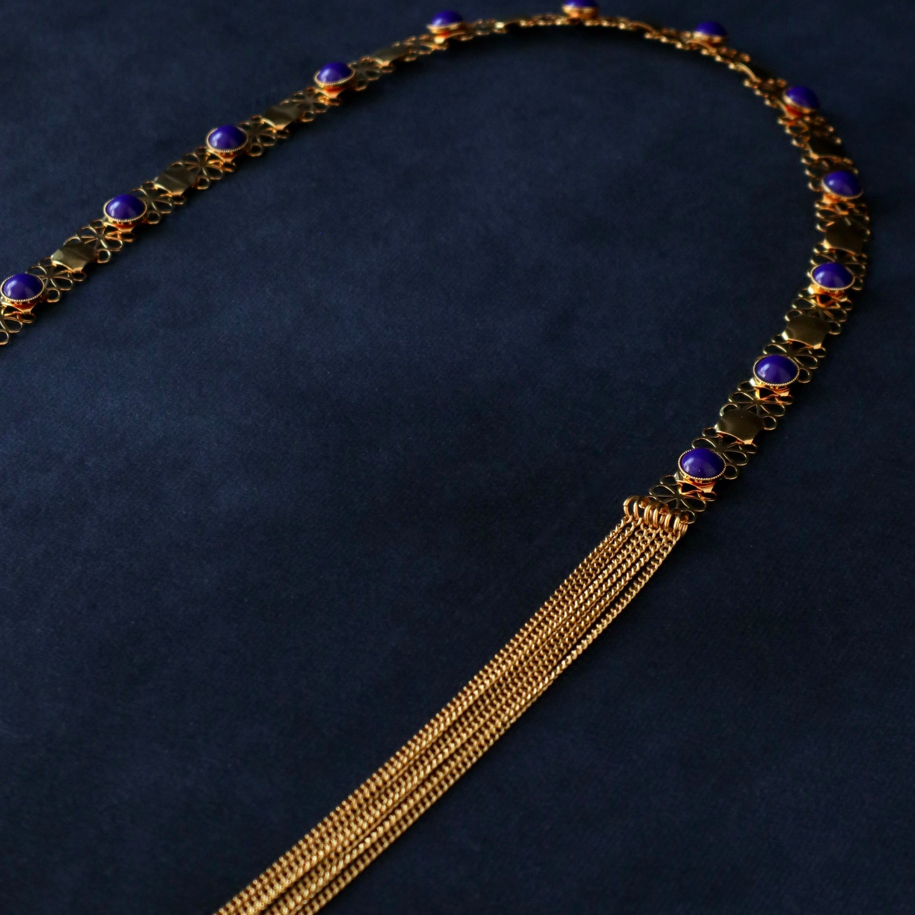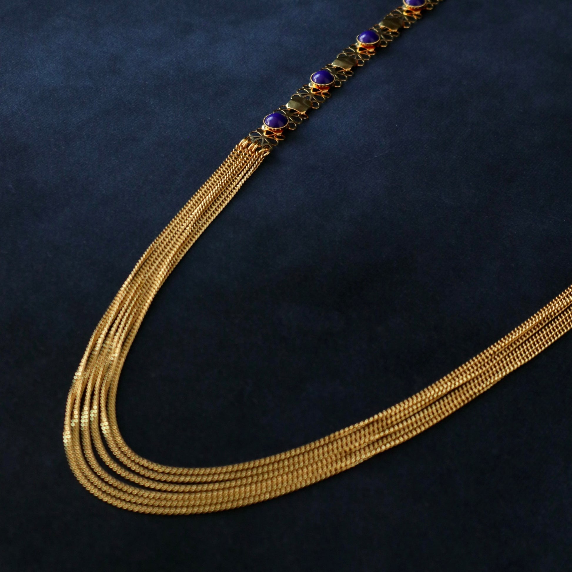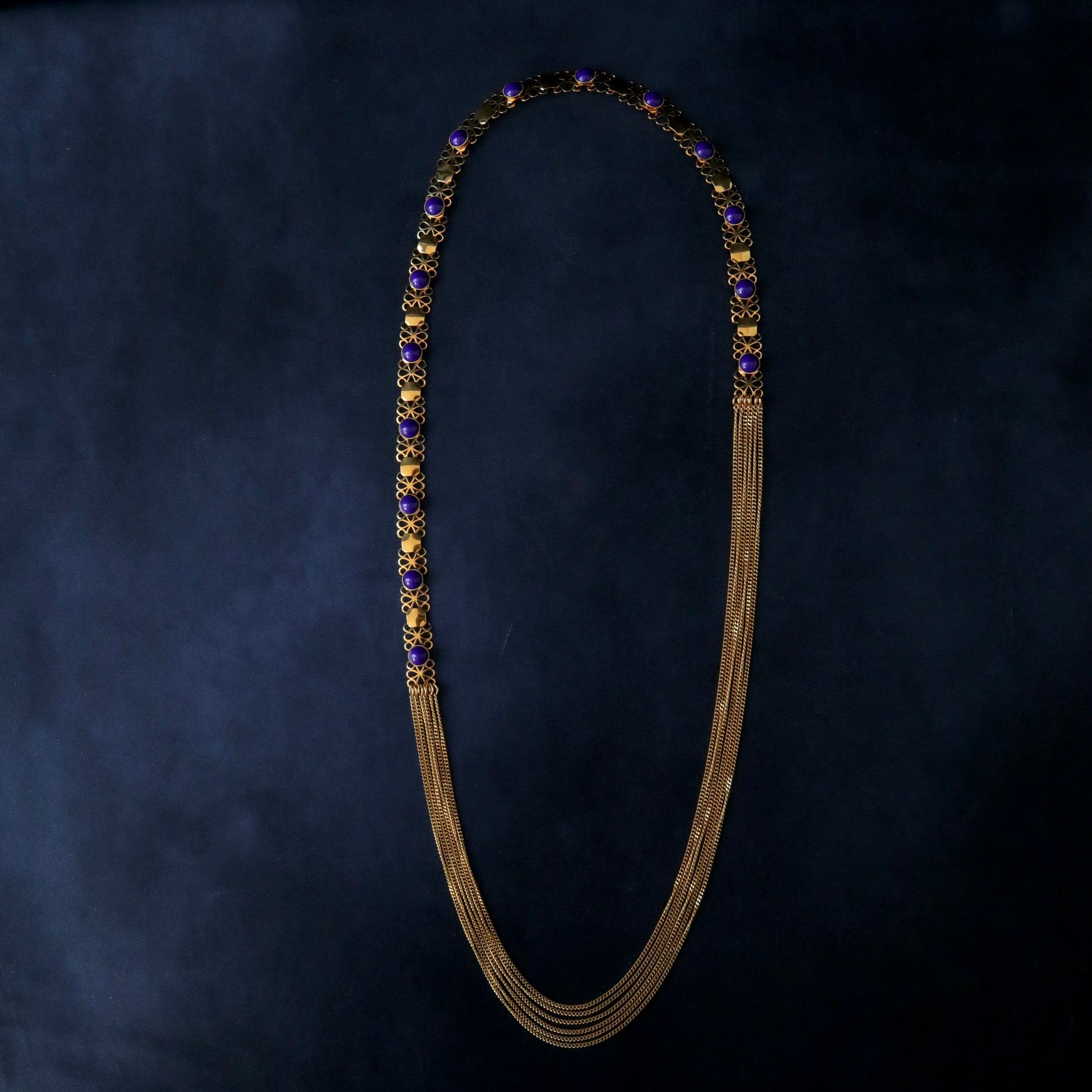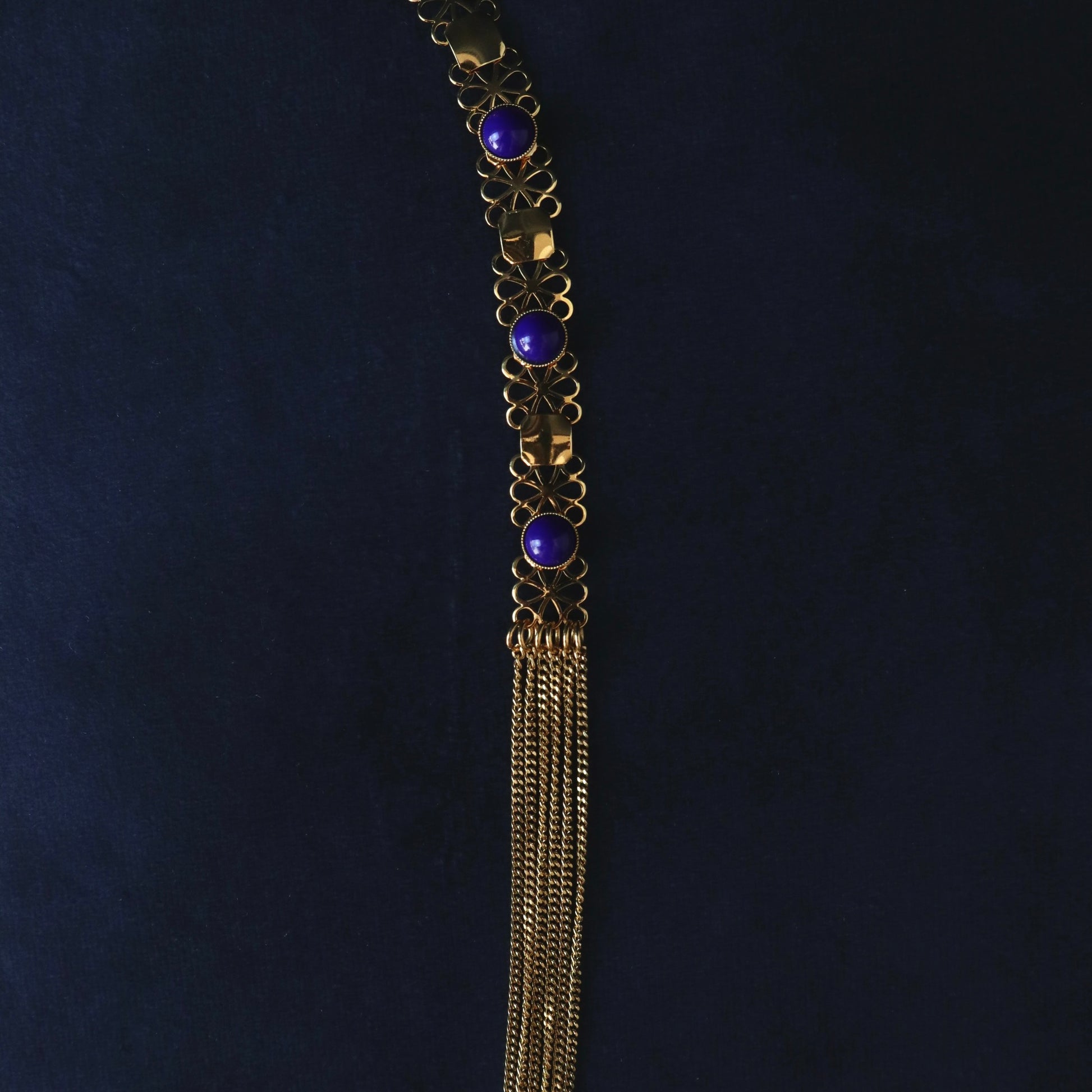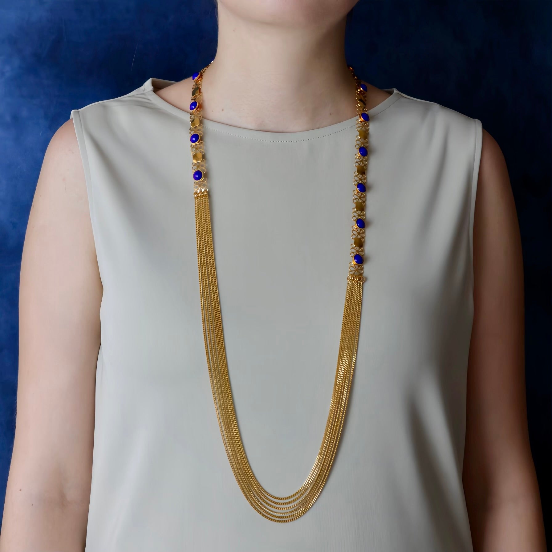 Un magnifique sautoir avec un contraste bleu marine et doré et un drapé en chaîne.