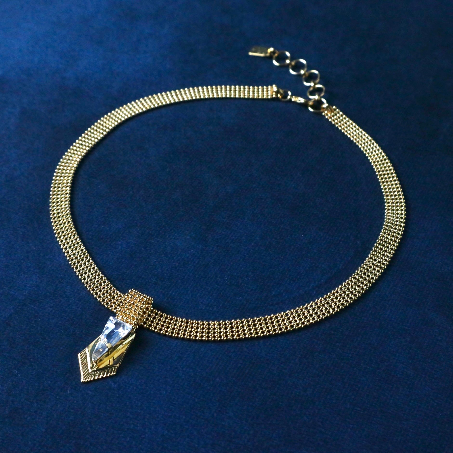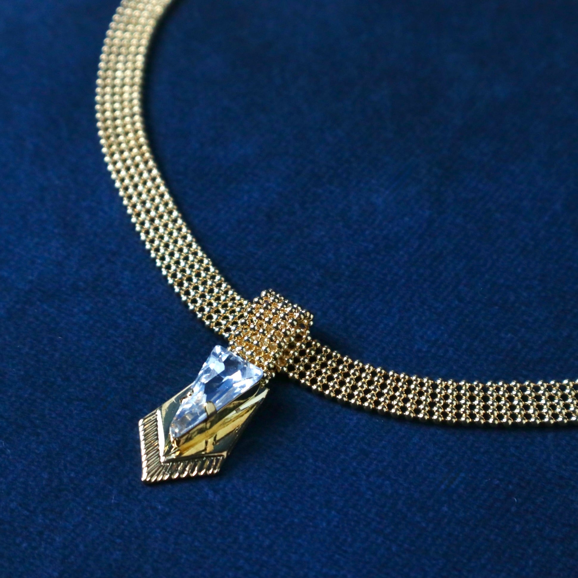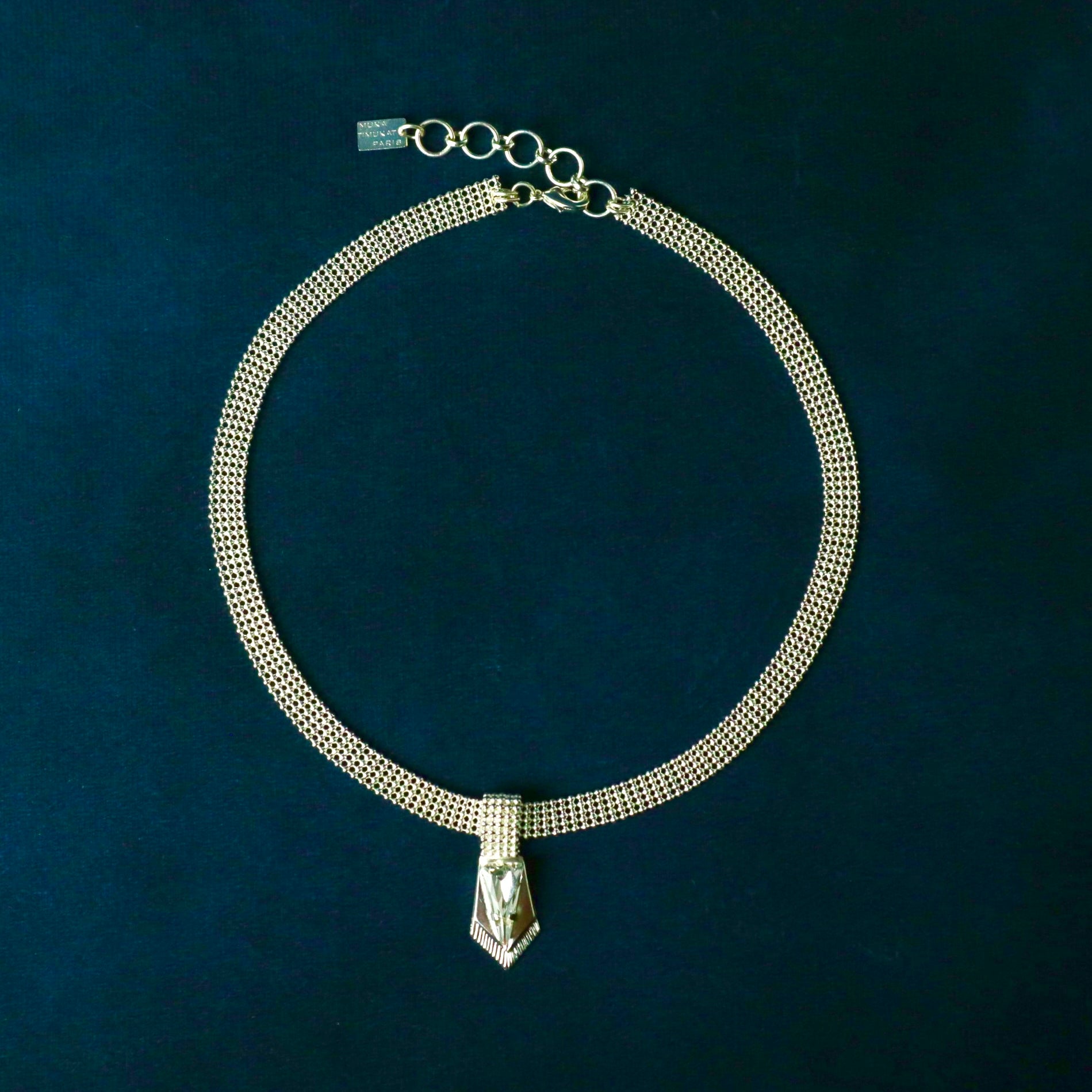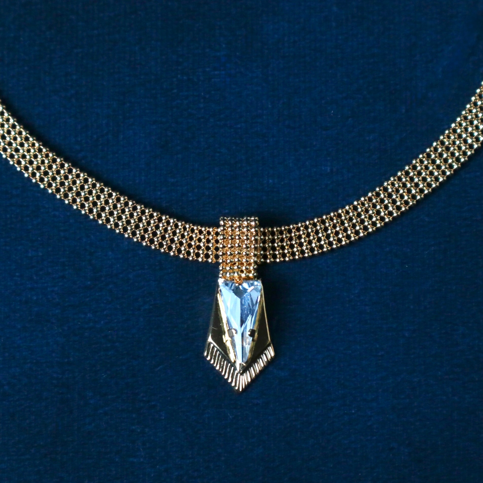 Un collier court élégant et féminin décorées d'un motif avec in cristal triangulaire pointus inspirés des armures au centre.