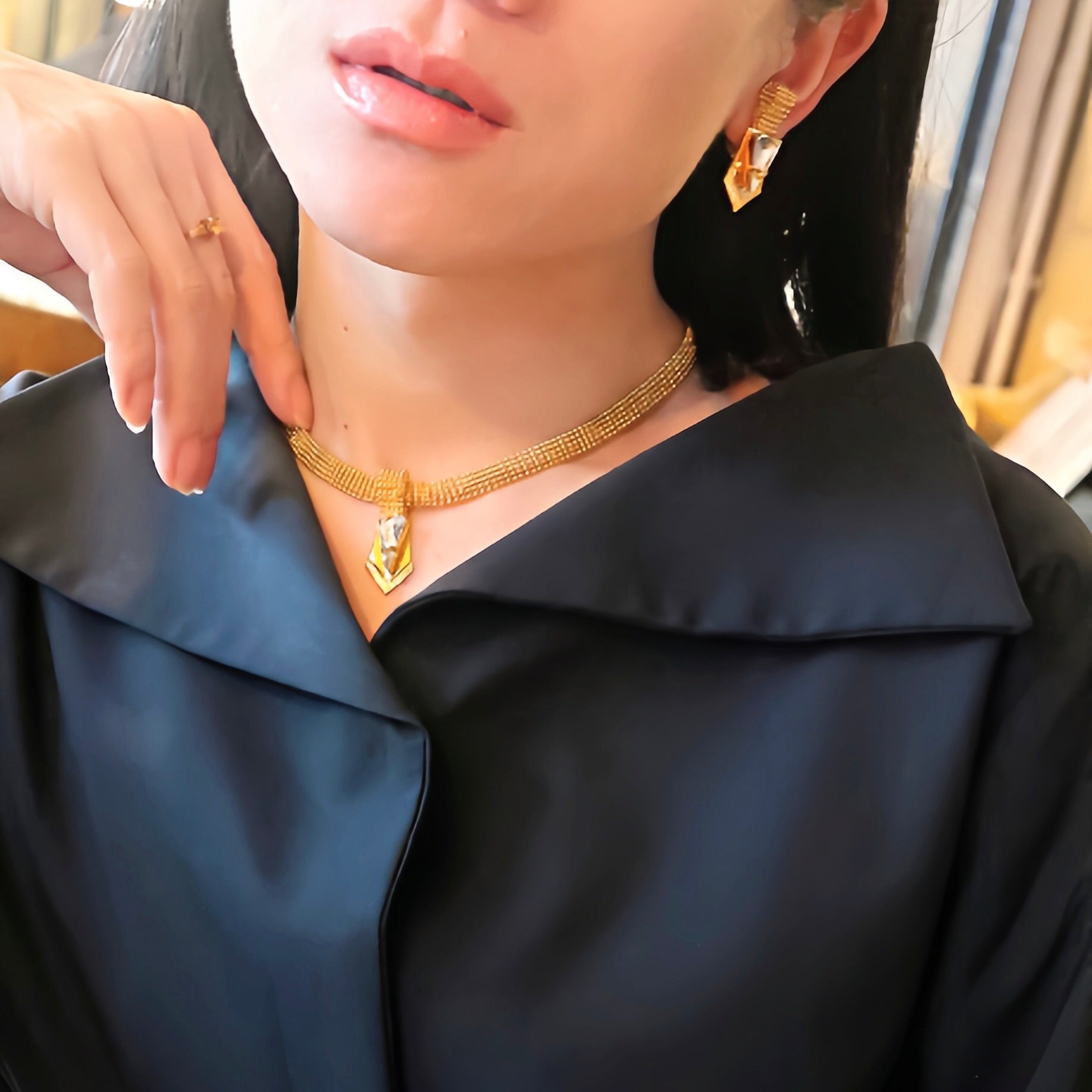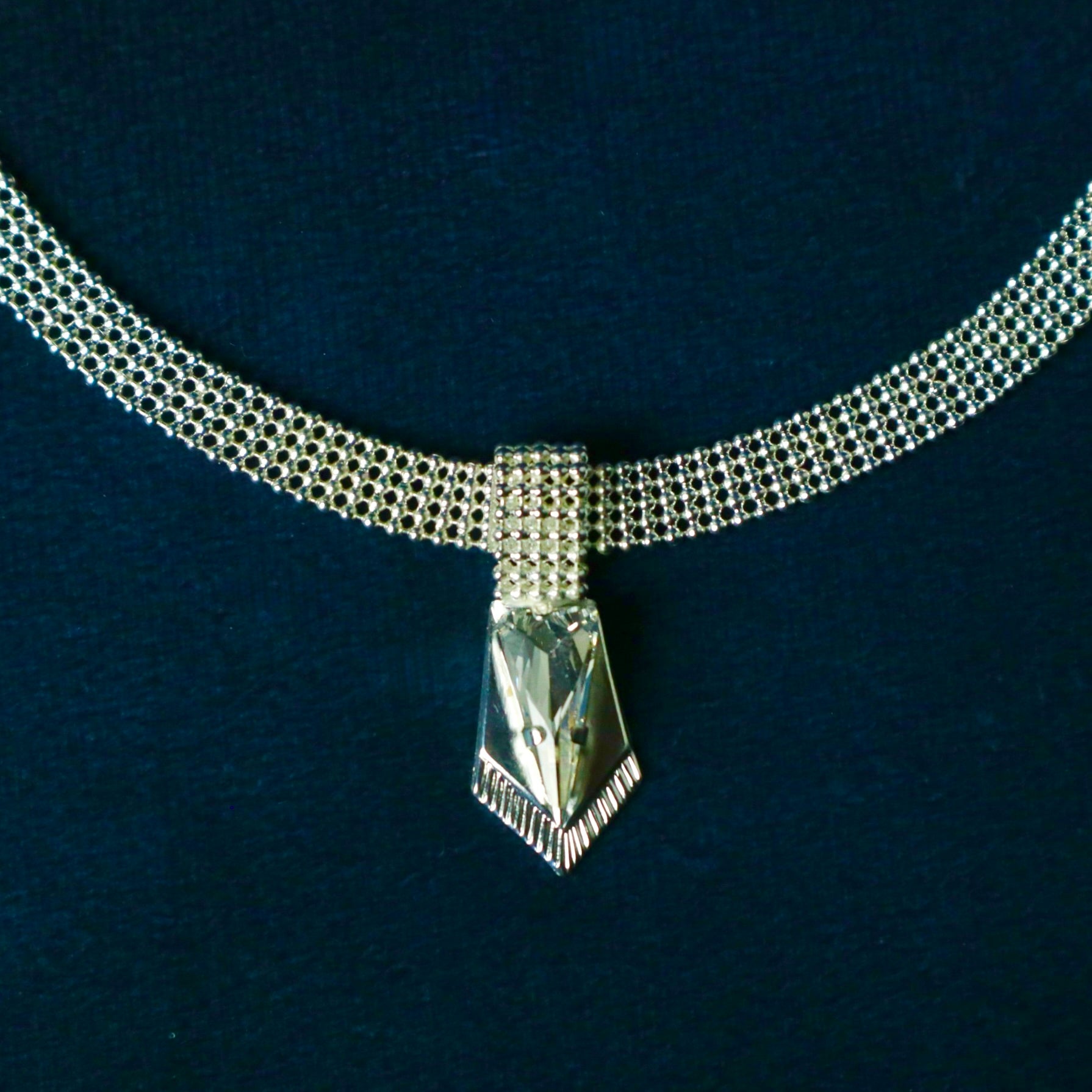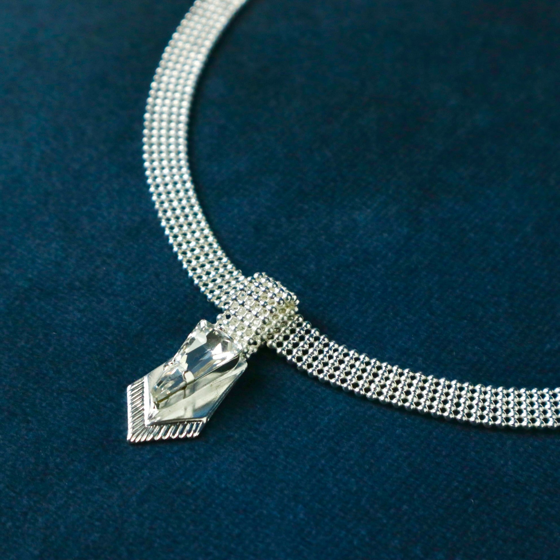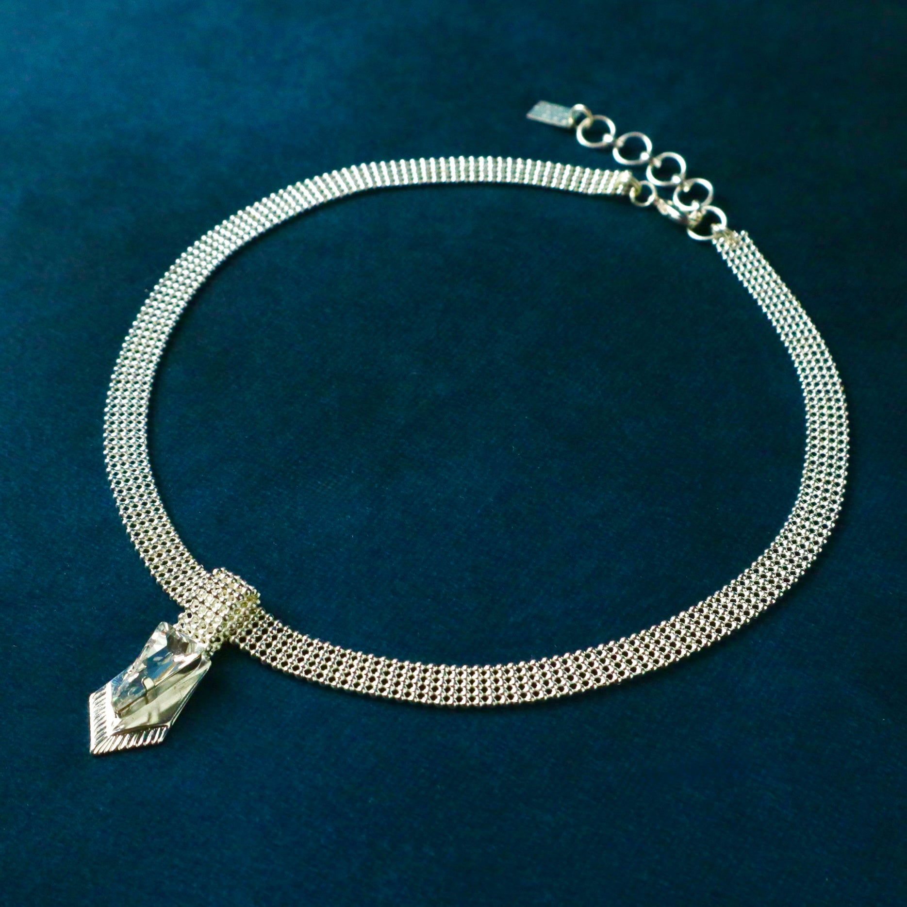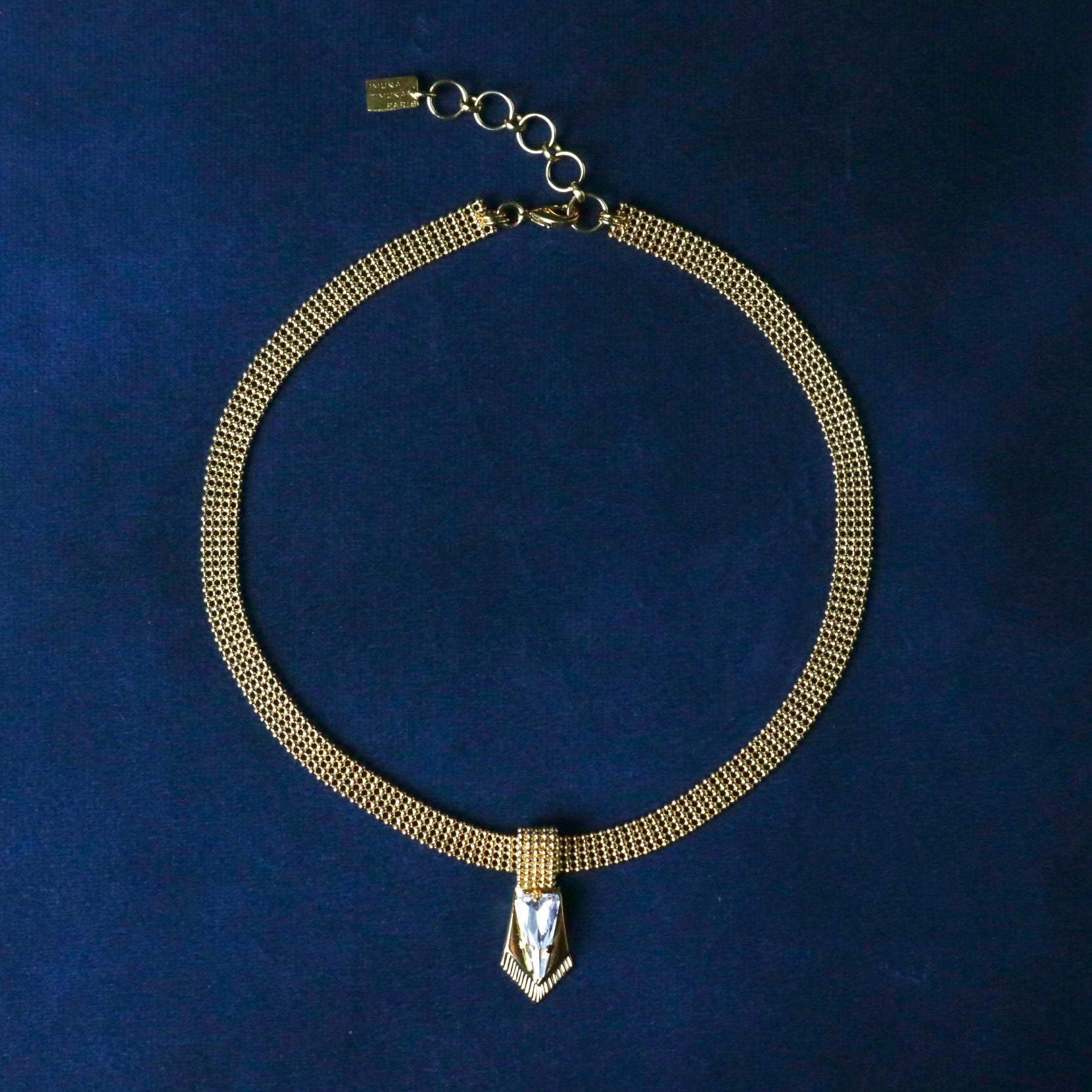 Un collier court élégant et féminin décorées d'un motif avec in cristal triangulaire pointus inspirés des armures au centre.