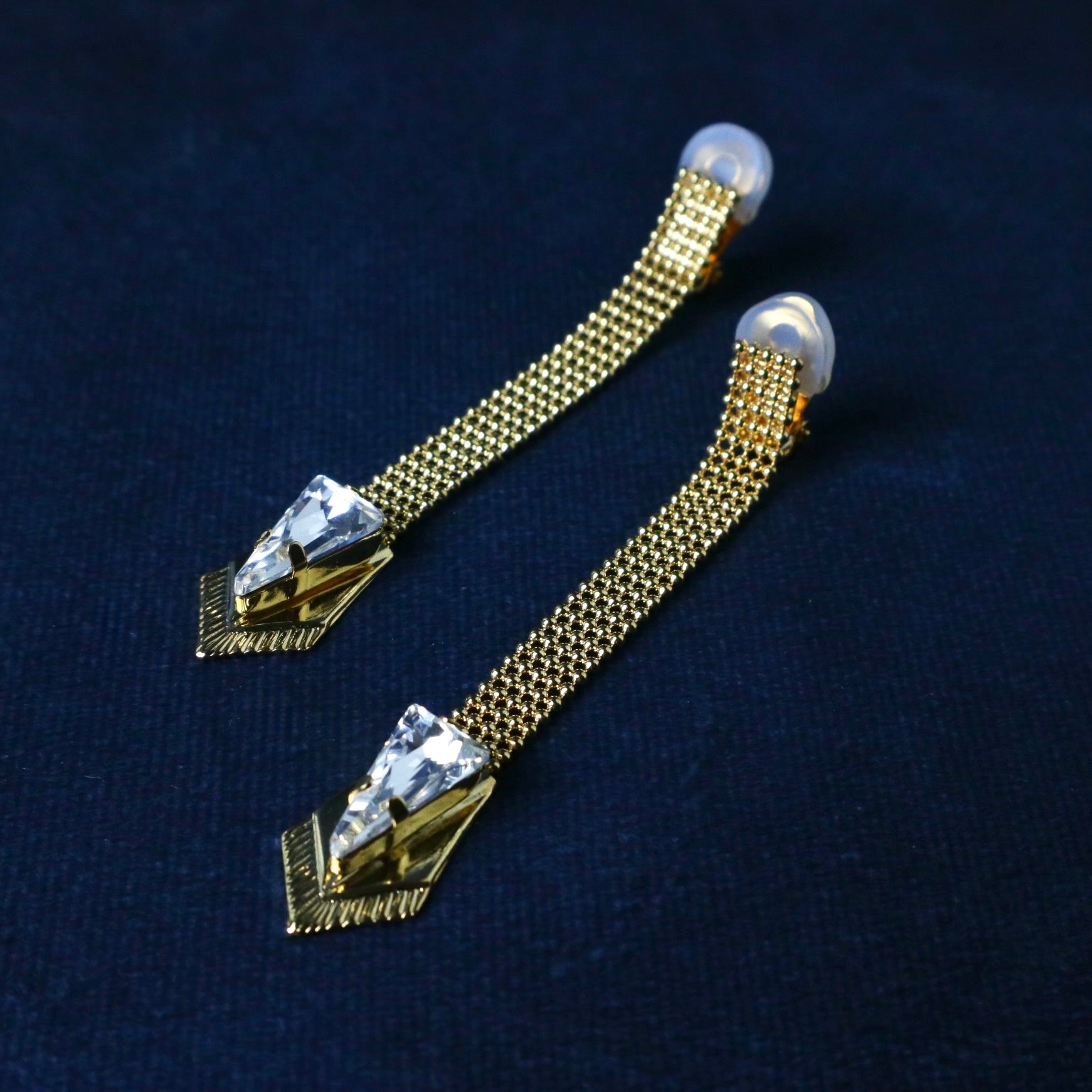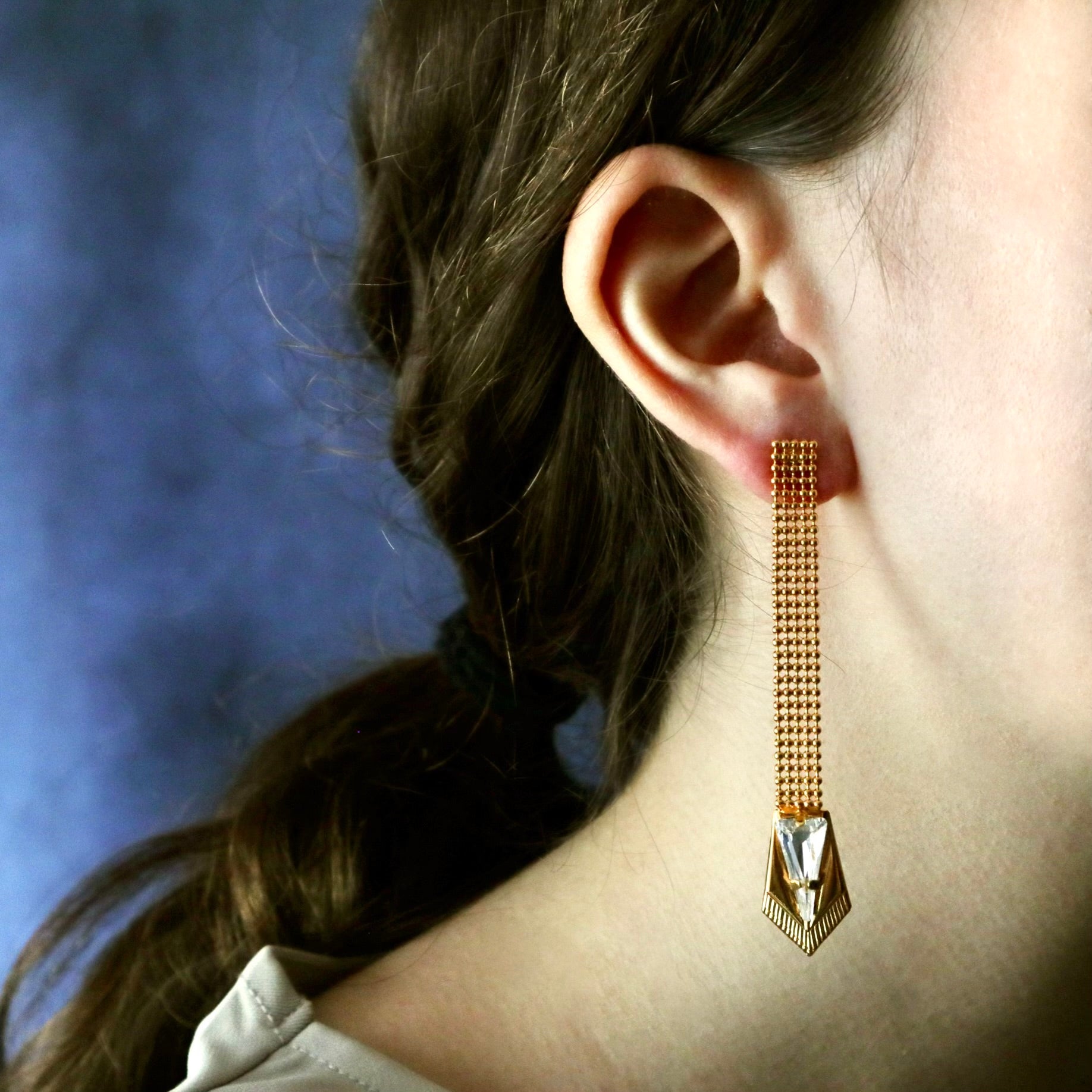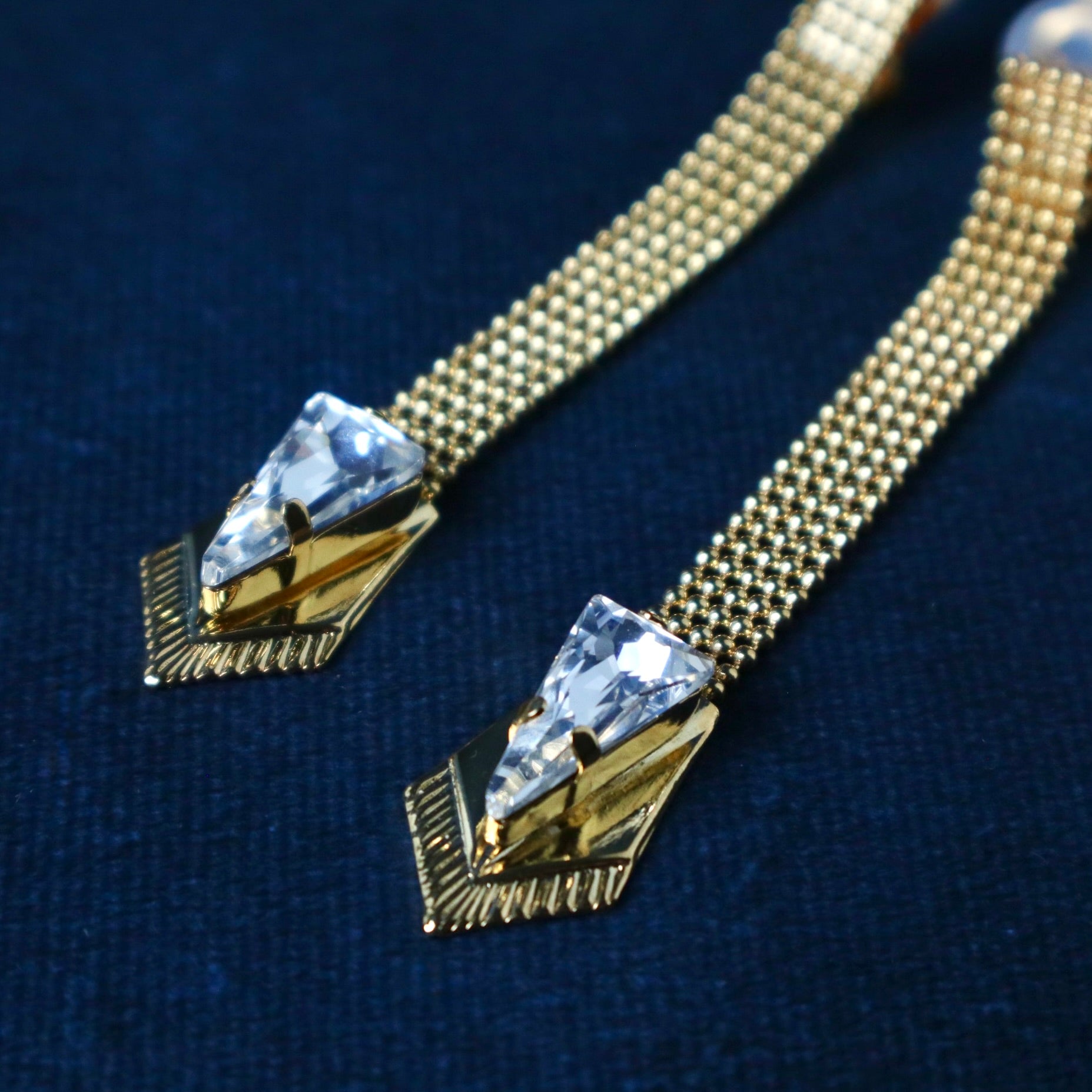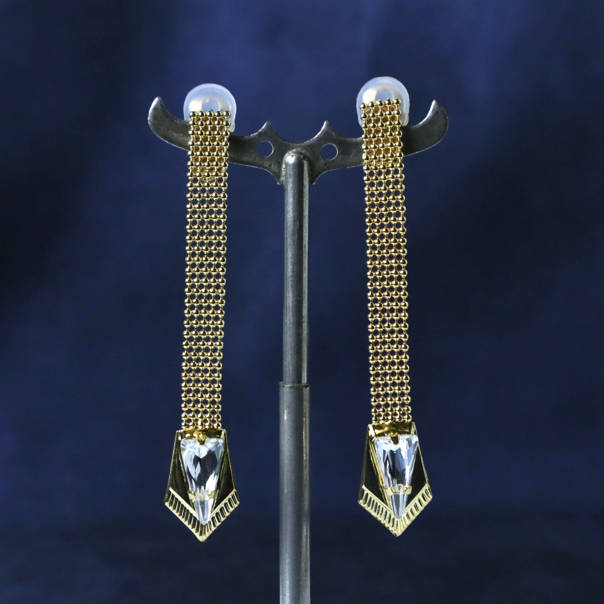 Boucles d'oreilles longues composées de parties décorées de cristaux triangulaires pointus inspirés des armures.