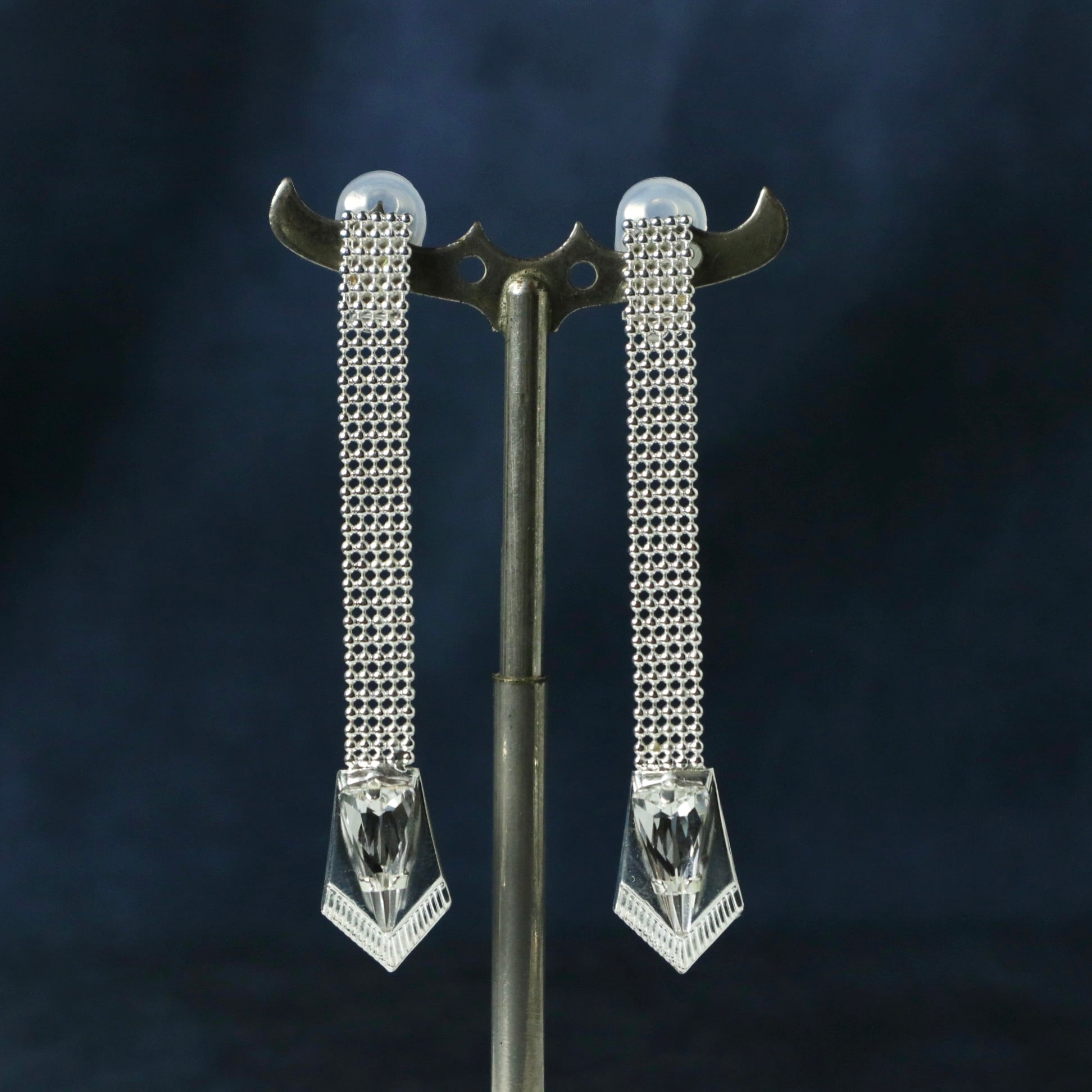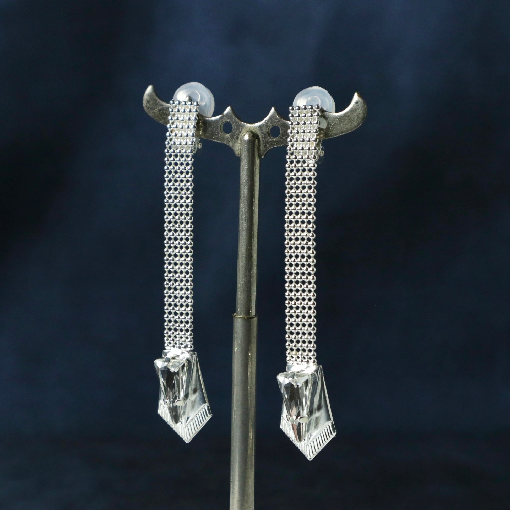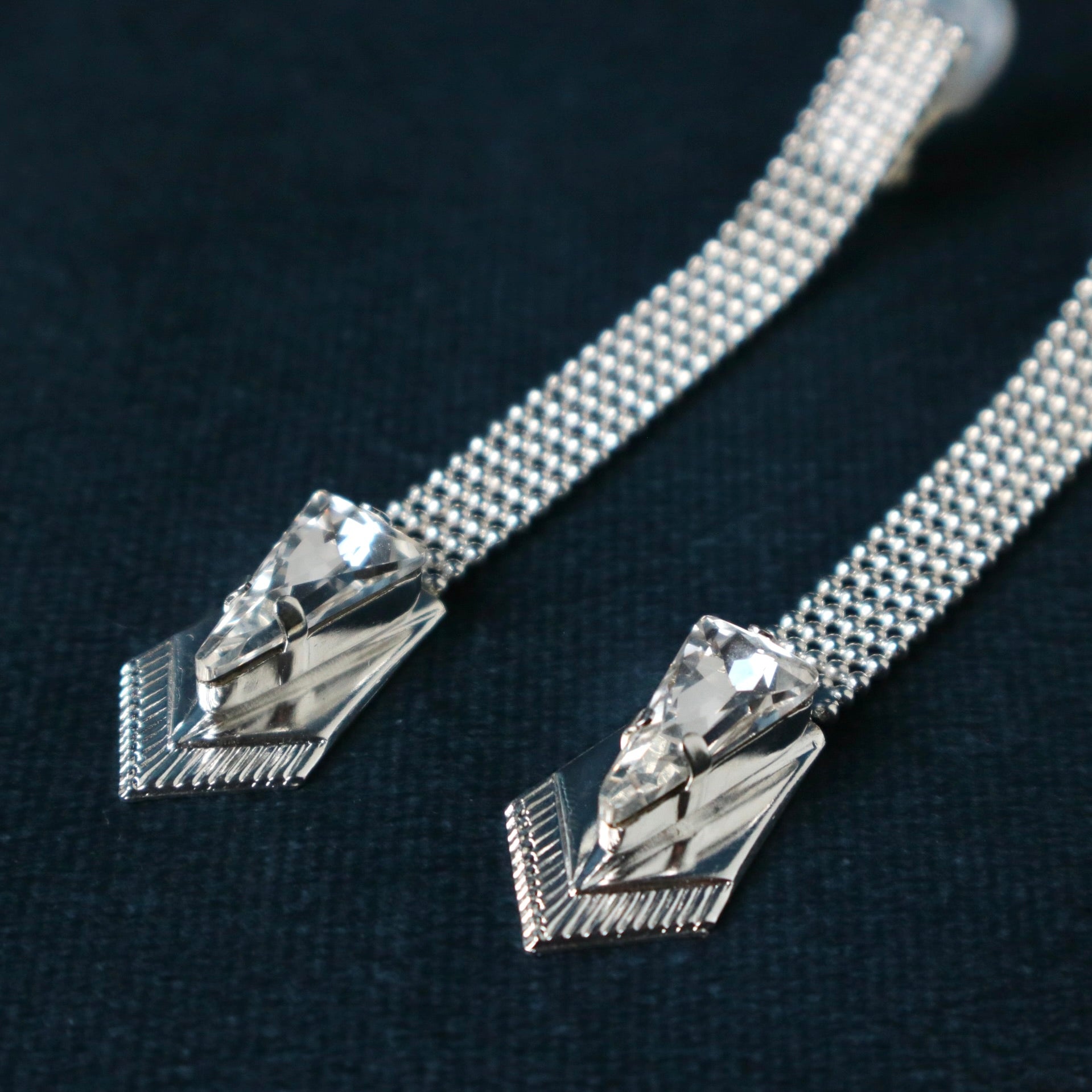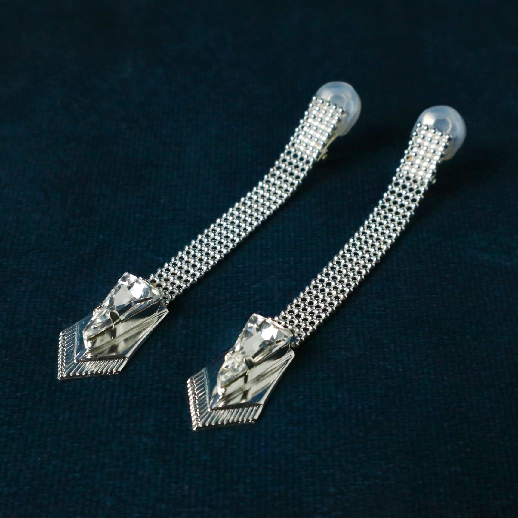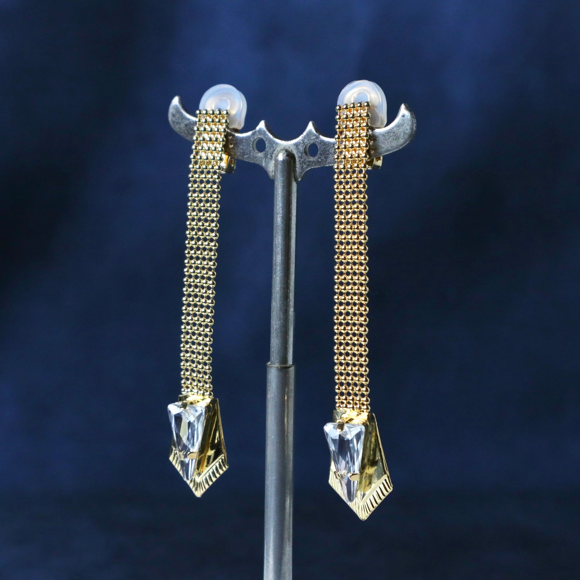 Boucles d'oreilles longues composées de parties décorées de cristaux triangulaires pointus inspirés des armures.