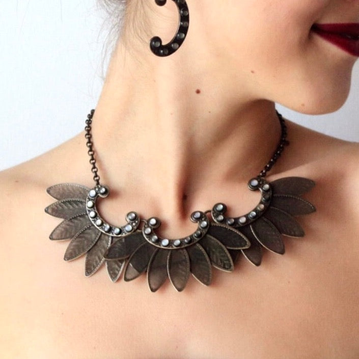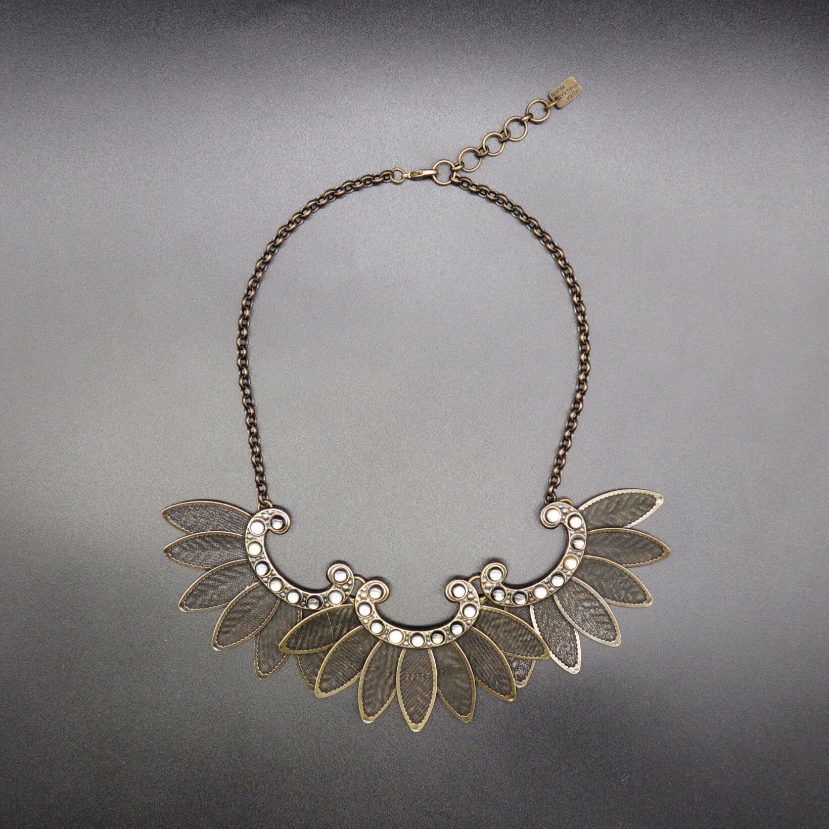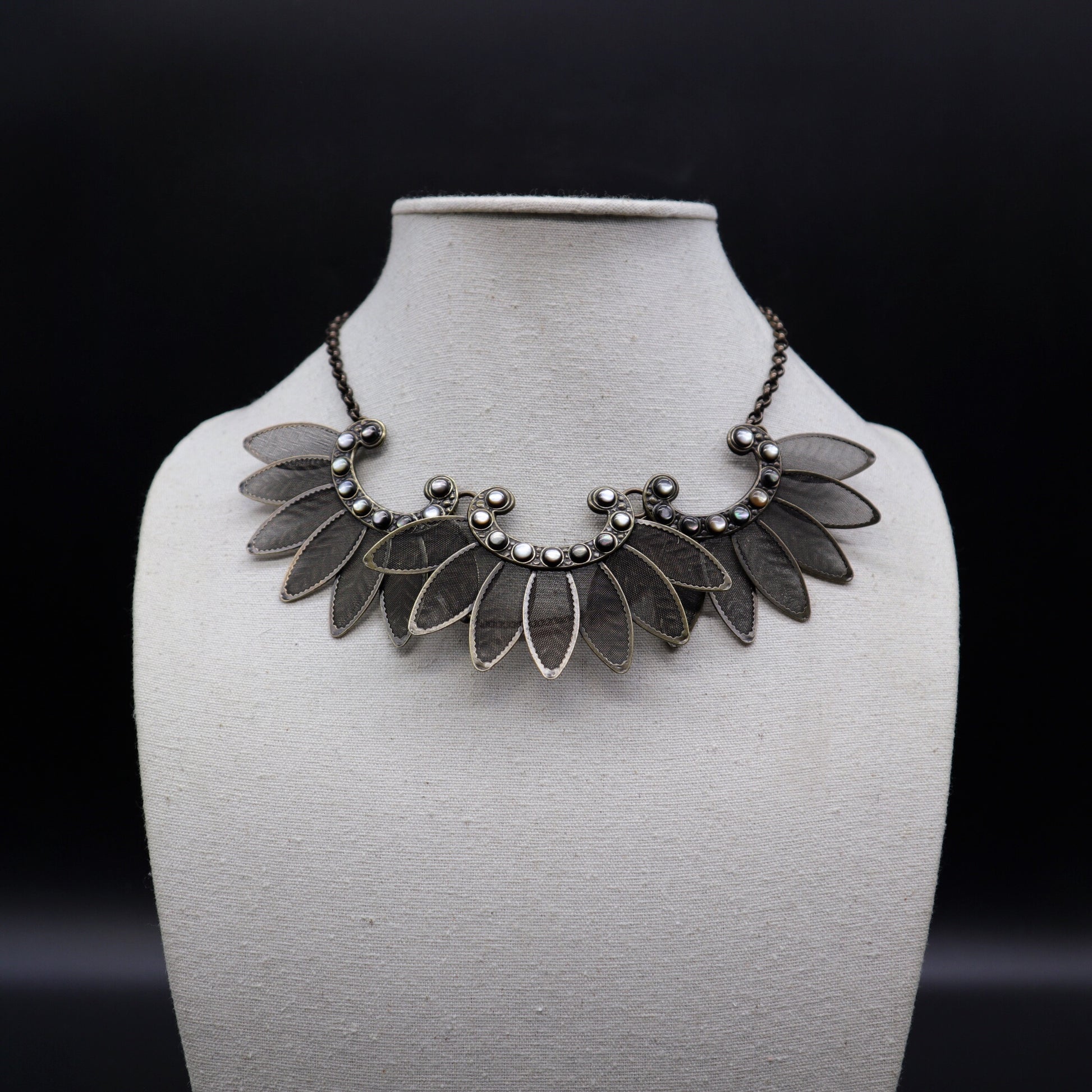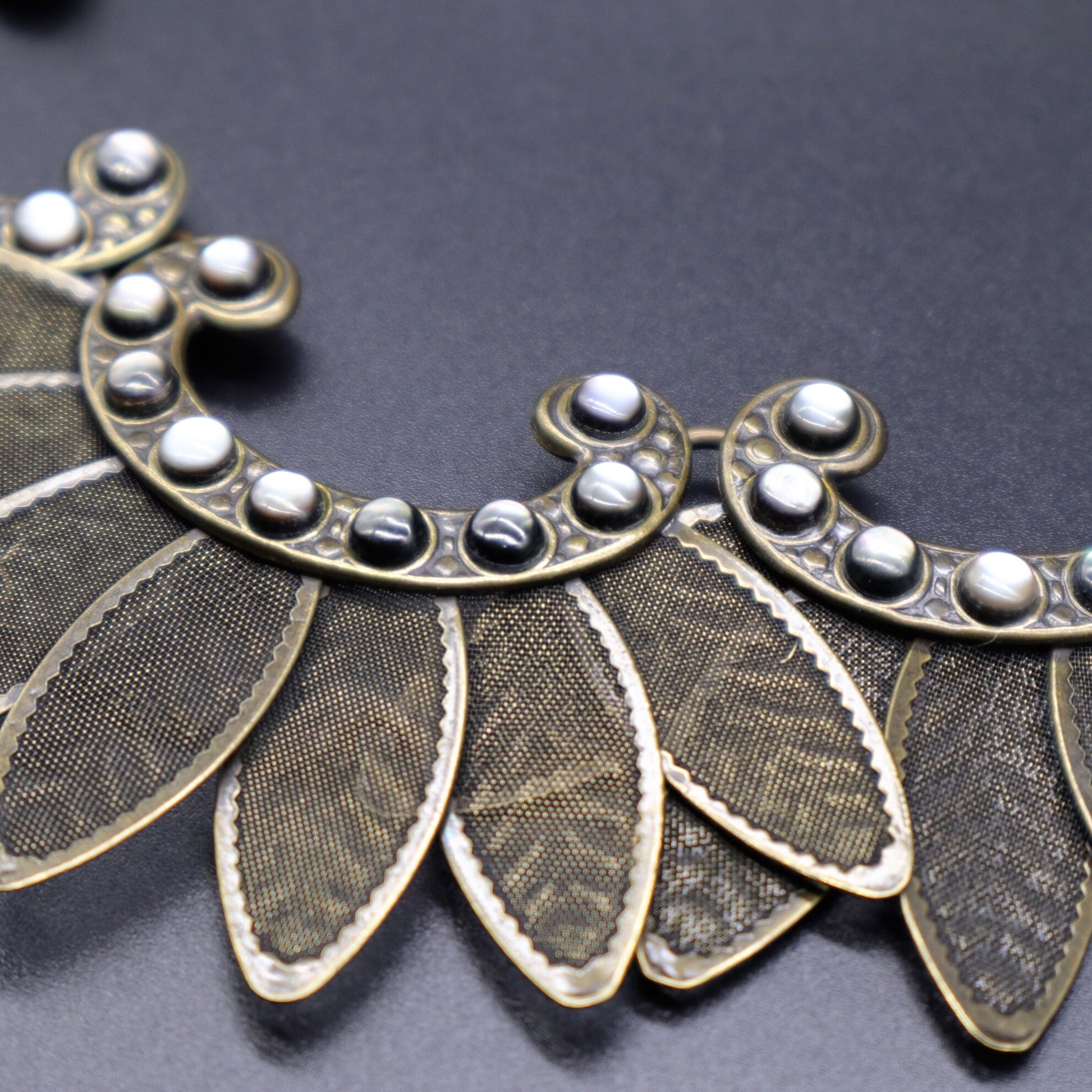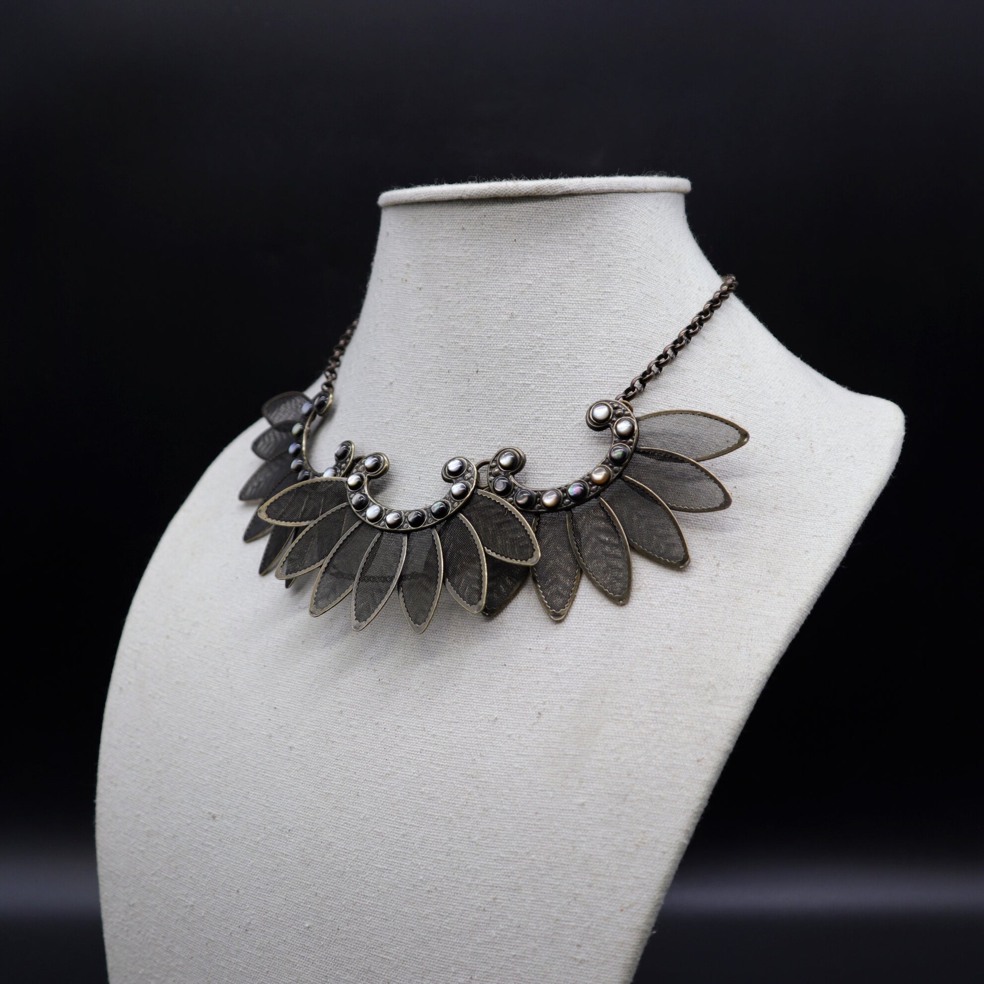 Collier assez imposant mais léger avec des motifs inspirés par la robe comme des fleurs de lotus portée par le statue bouddhiste de la période Nara au Japon.