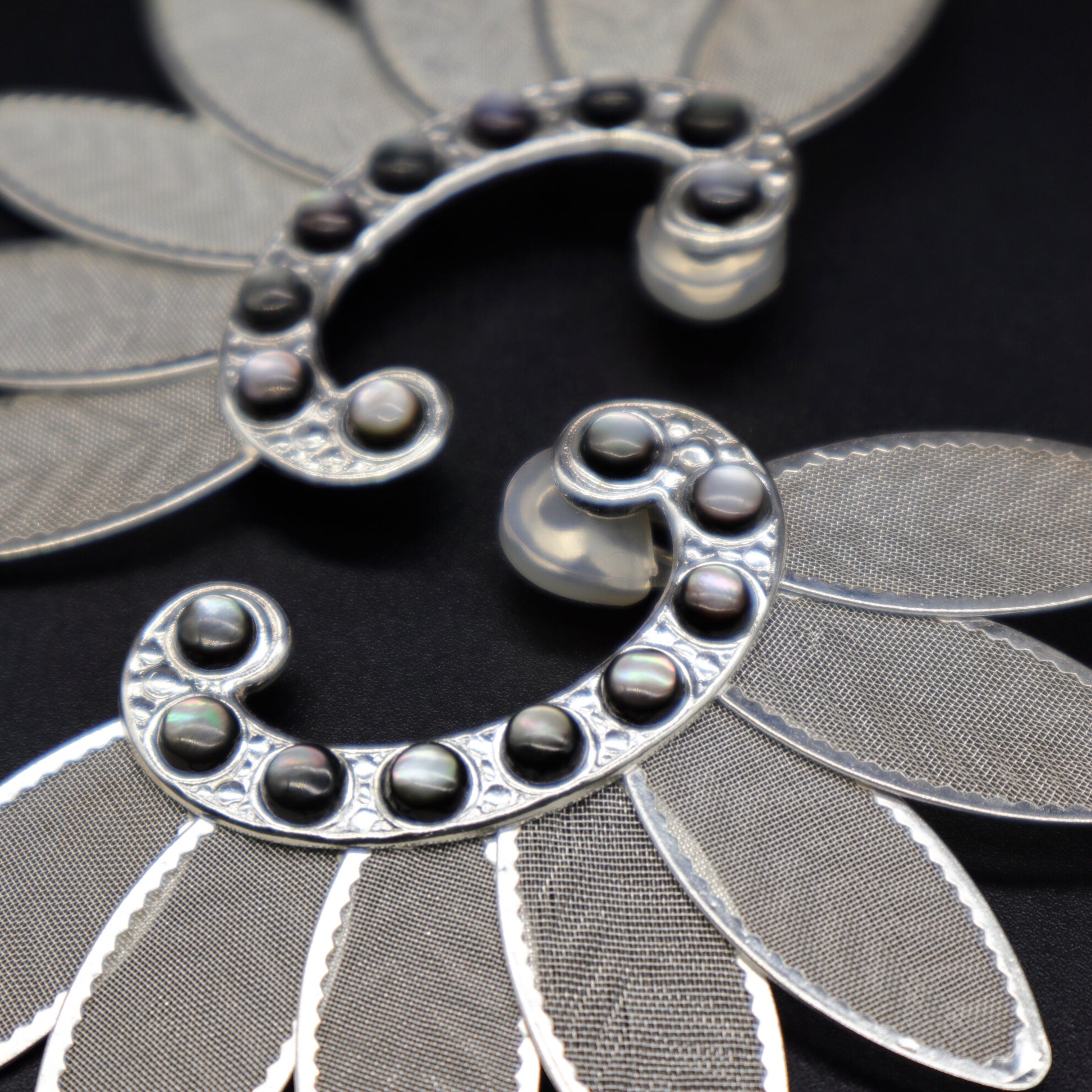 Les pétales en maille et le calice de la fleur de lotus sont décorés de nacre grise.