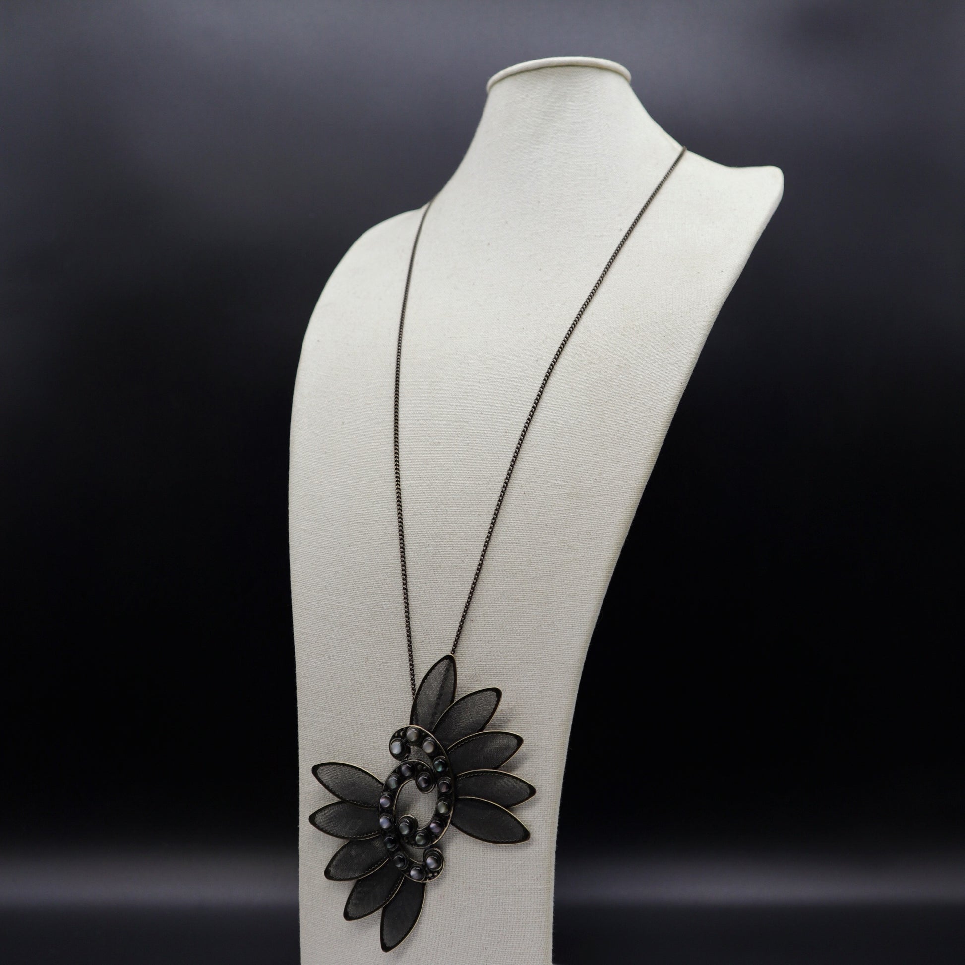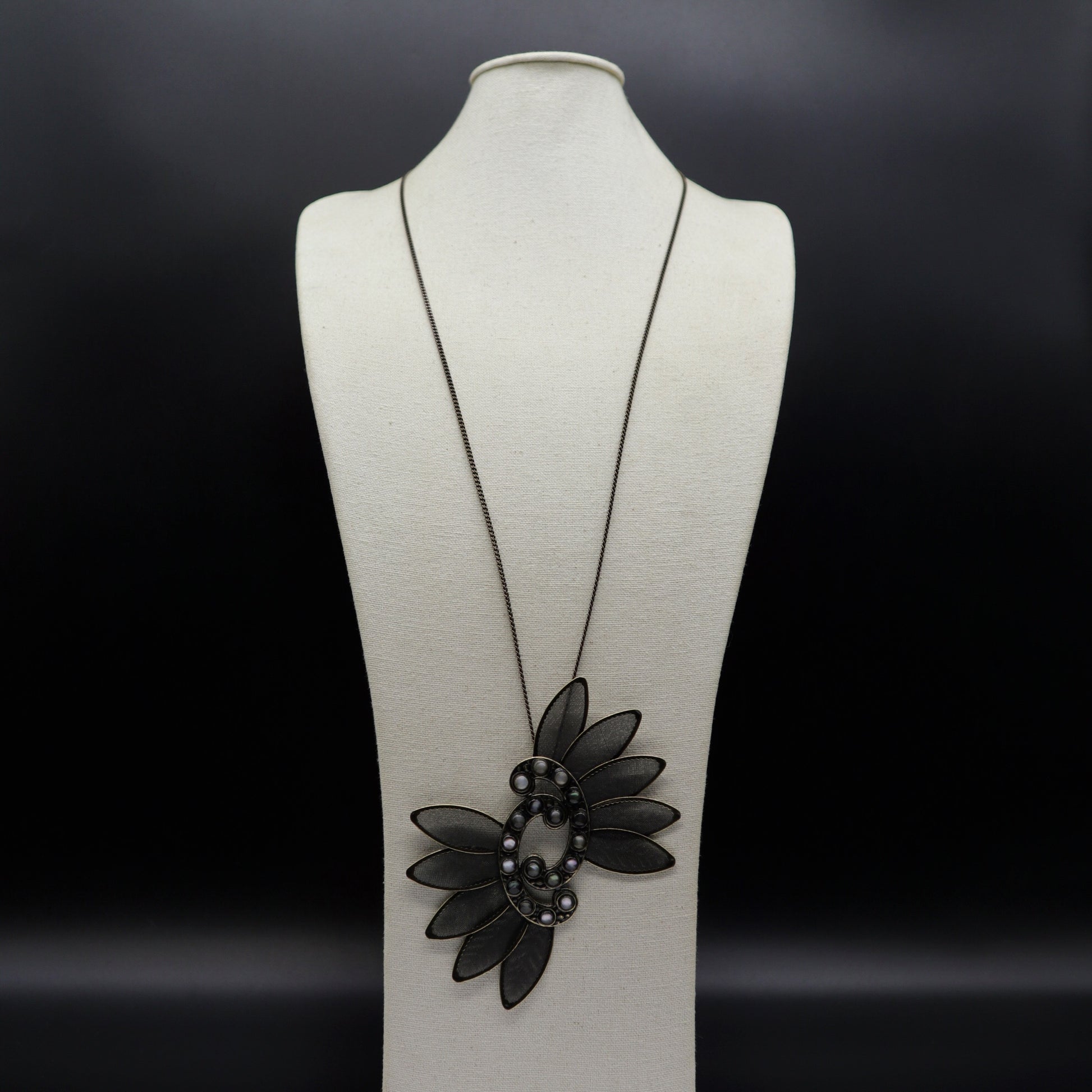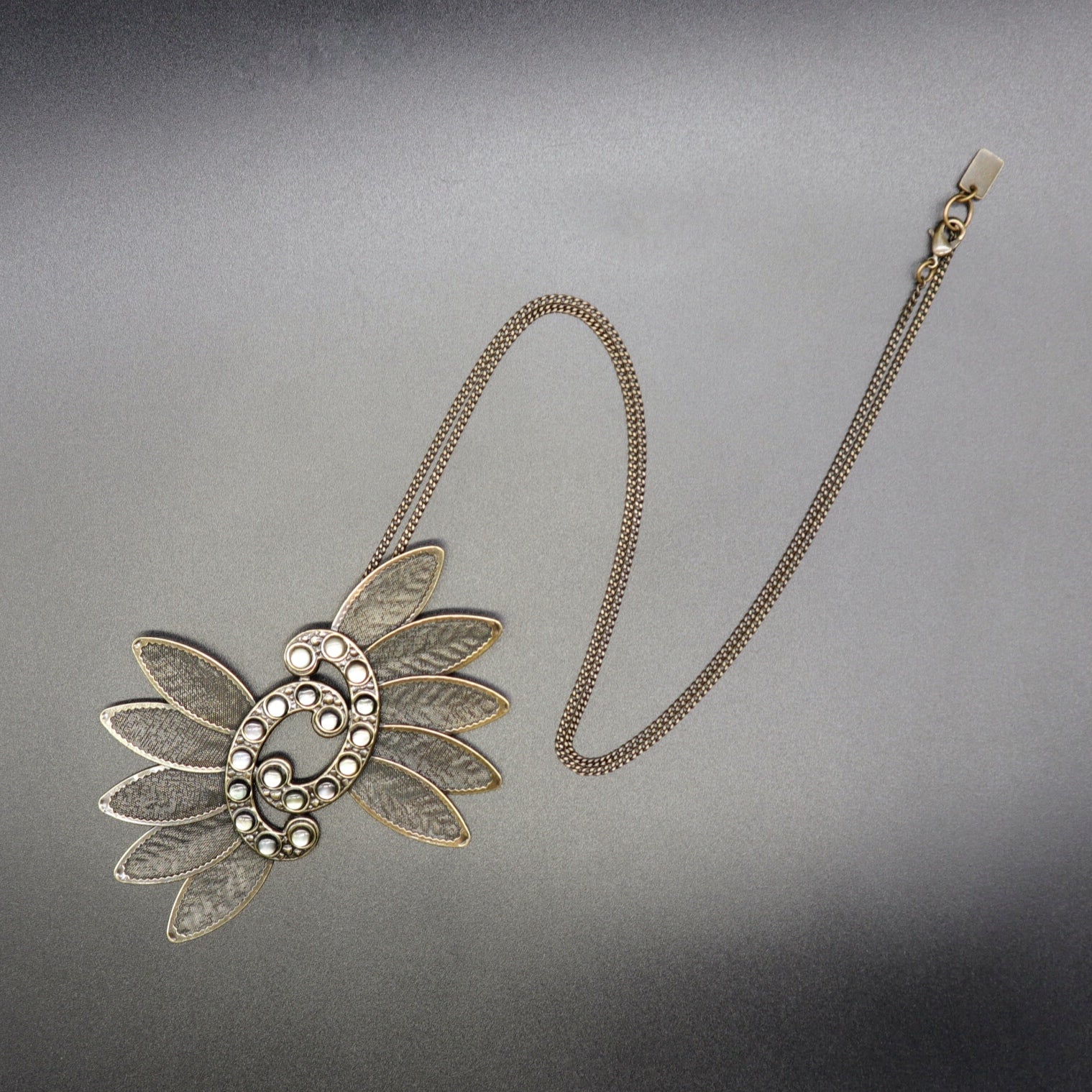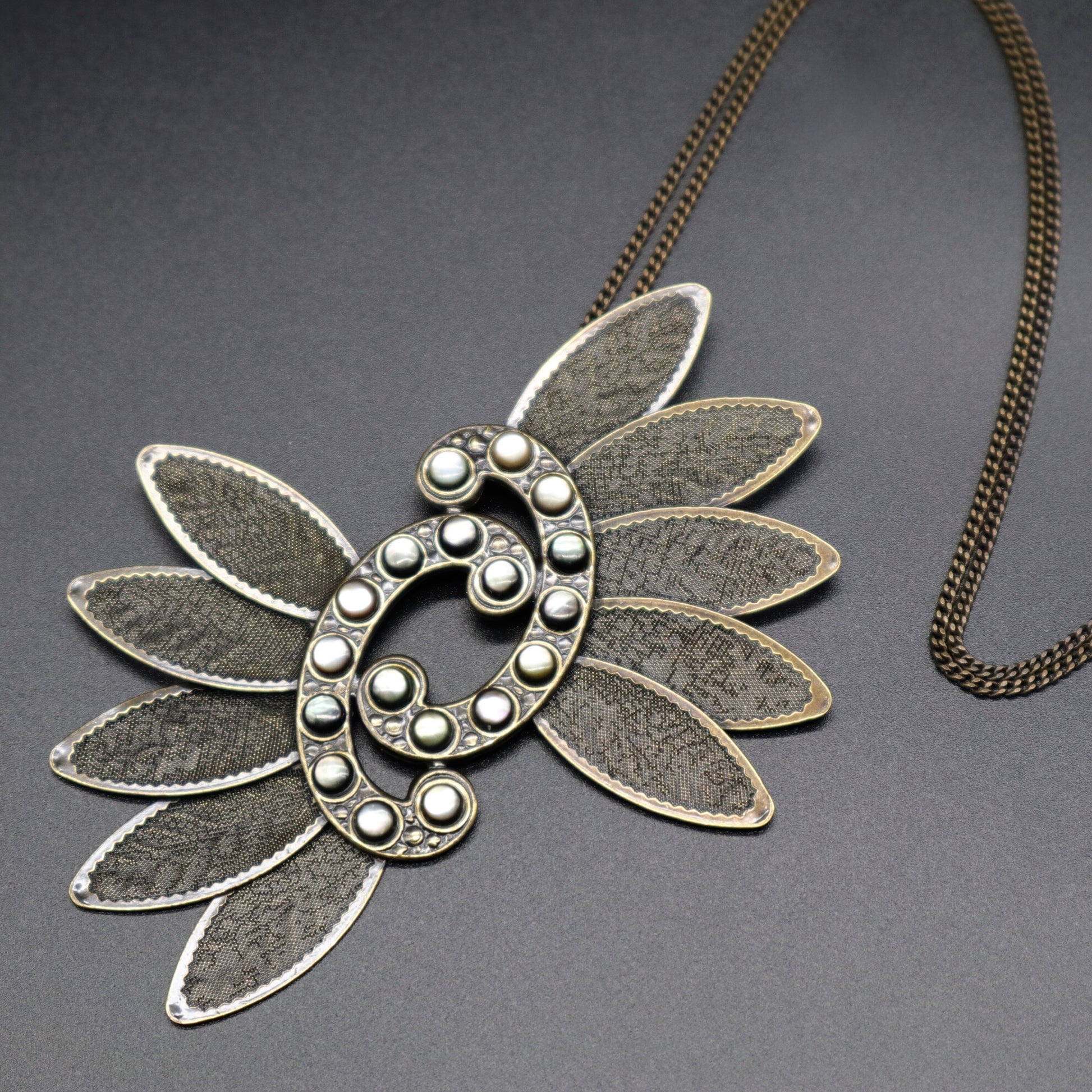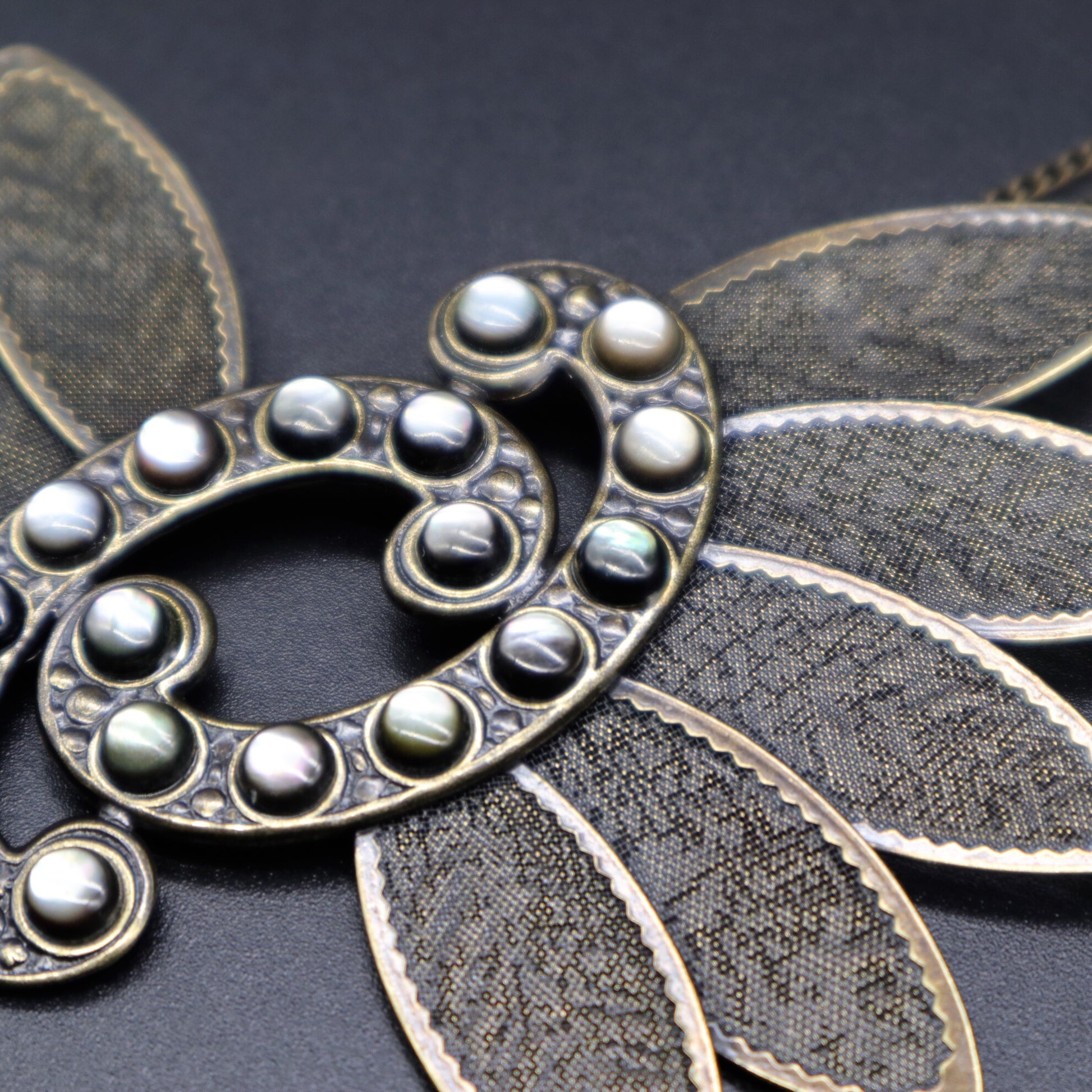 Collier assez imposant mais léger avec un motif inspiré par la robe comme des fleurs de lotus portée par le statues bouddhiste de la période Nara au Japon.