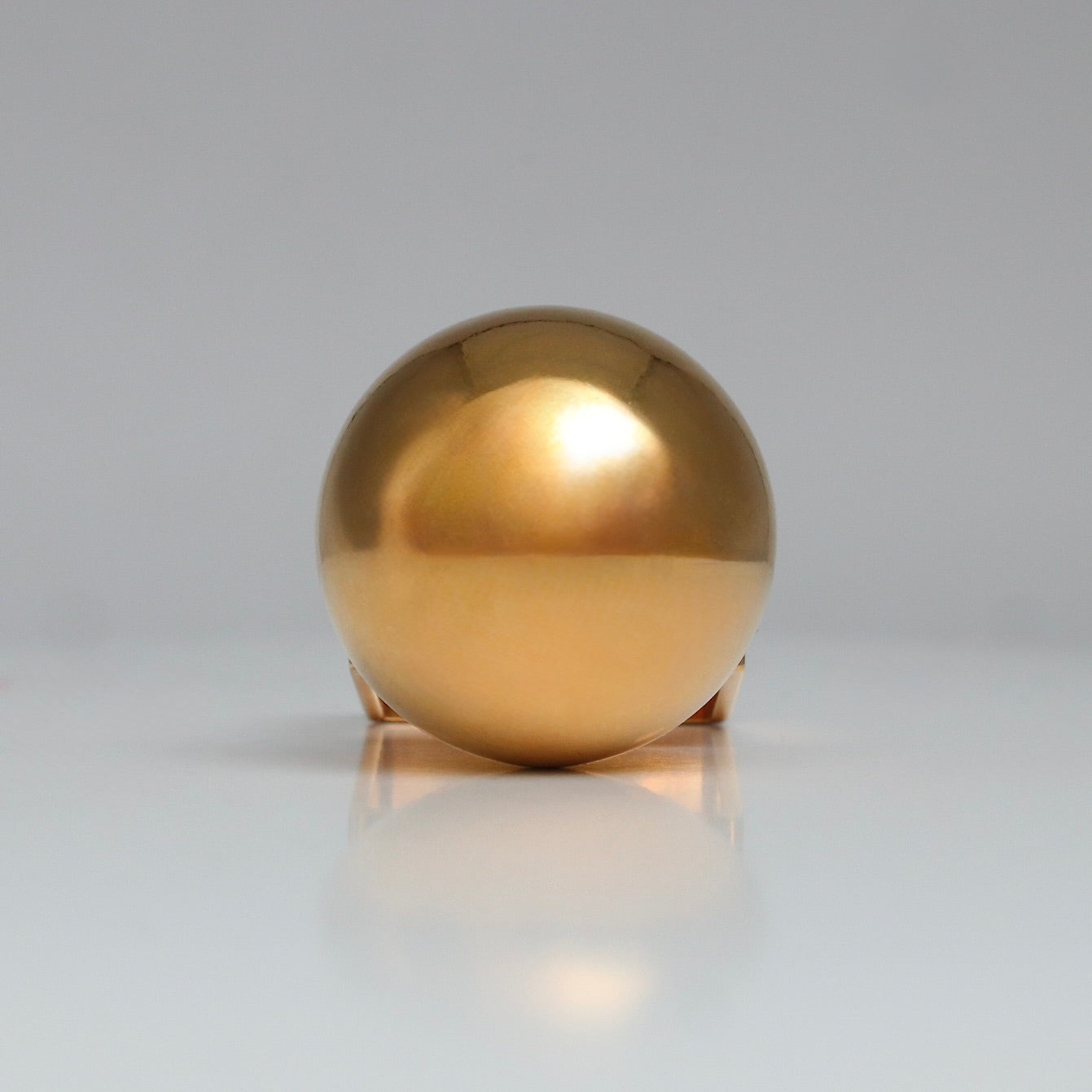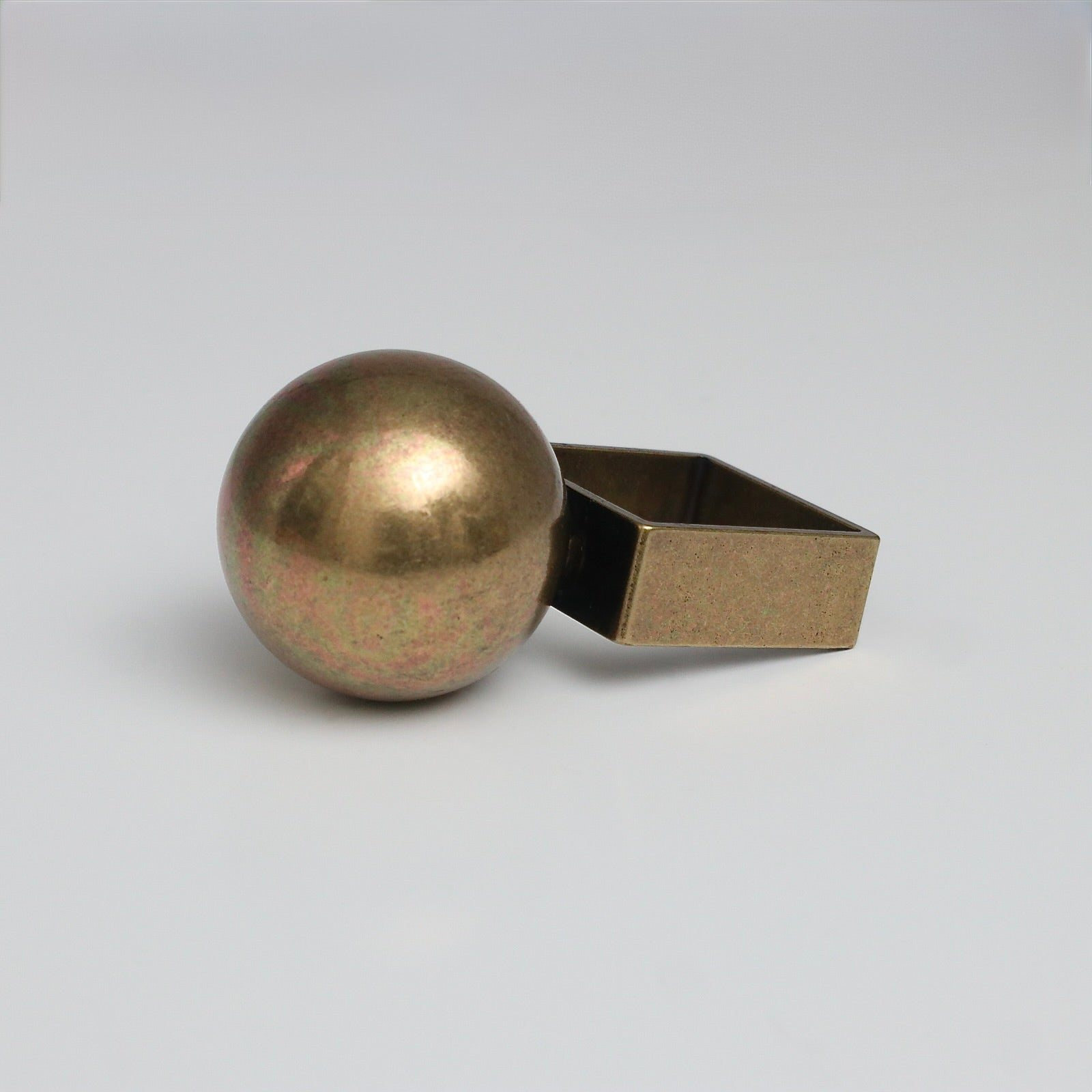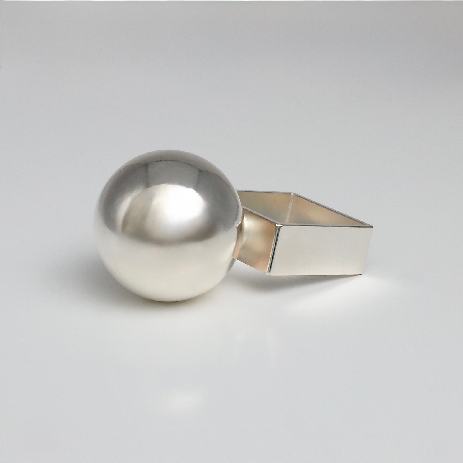 幅広7mmのスクエアフォルムに、直径20mmのメタリックな球体を配したリングです。