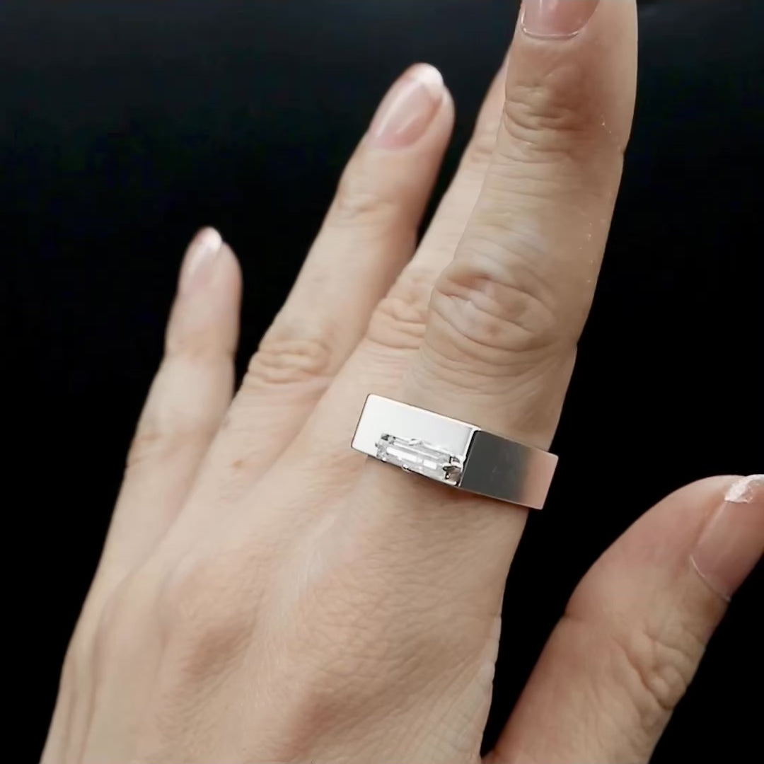 スクエア型の特性上、指に通す際はリングを斜めにするとスムーズです。