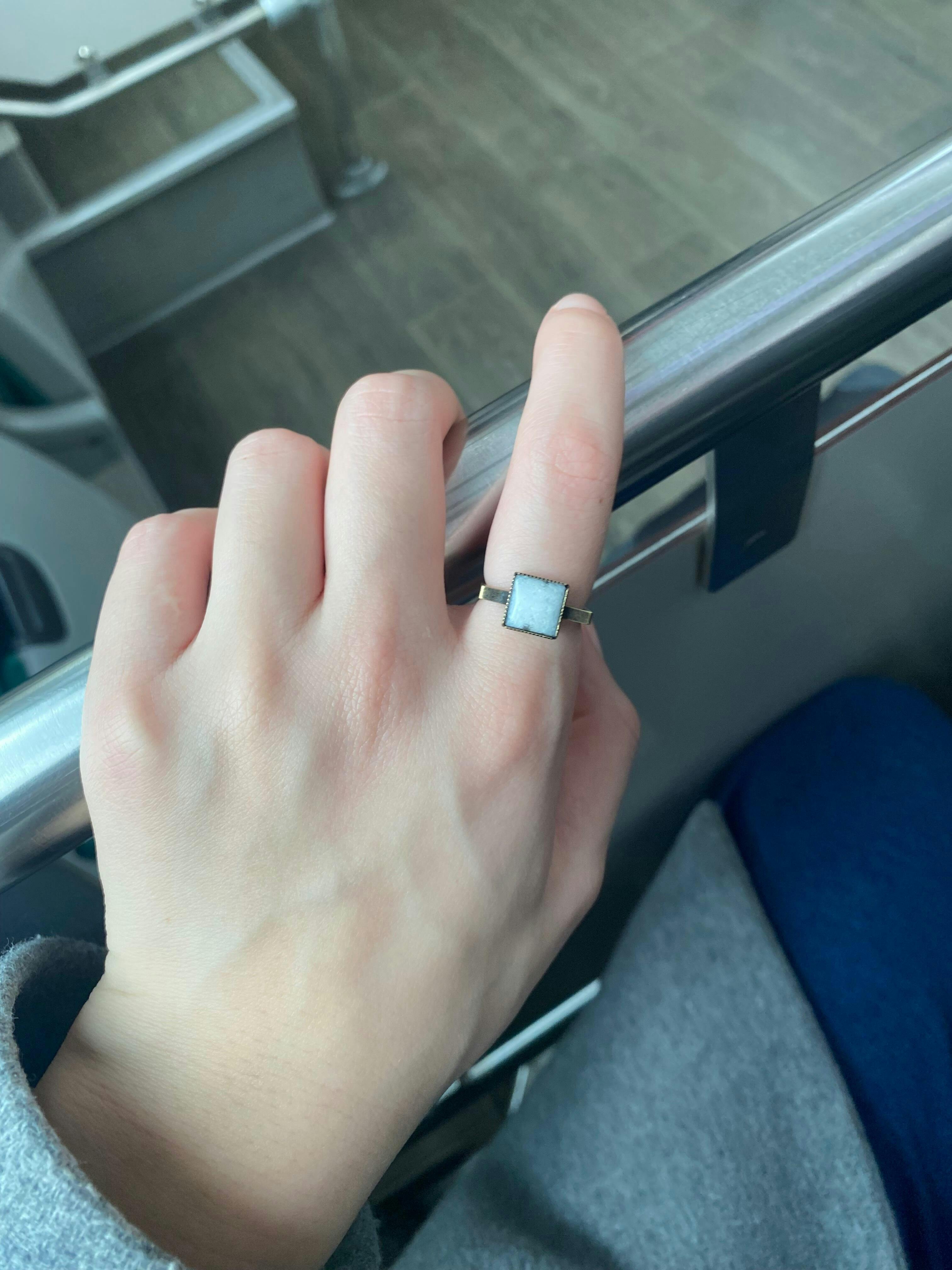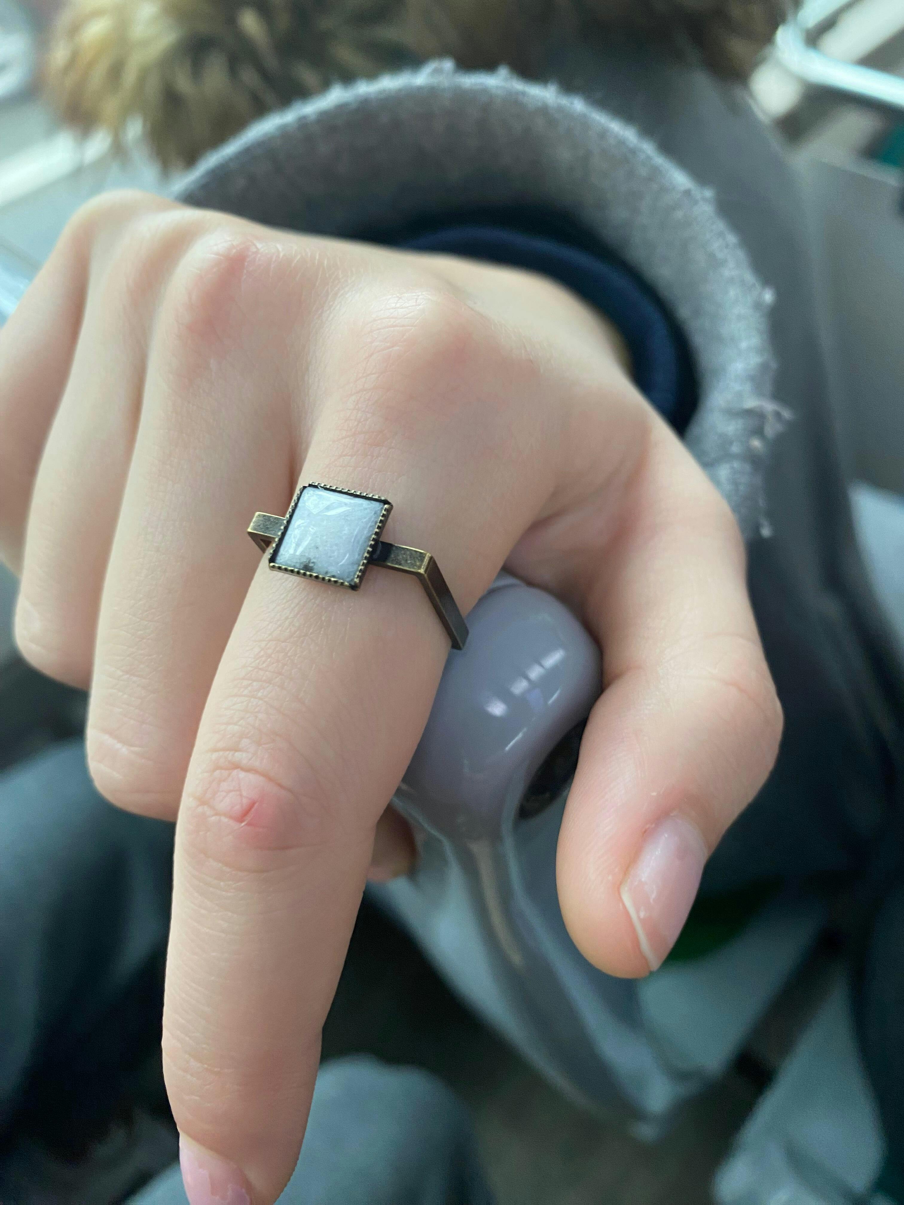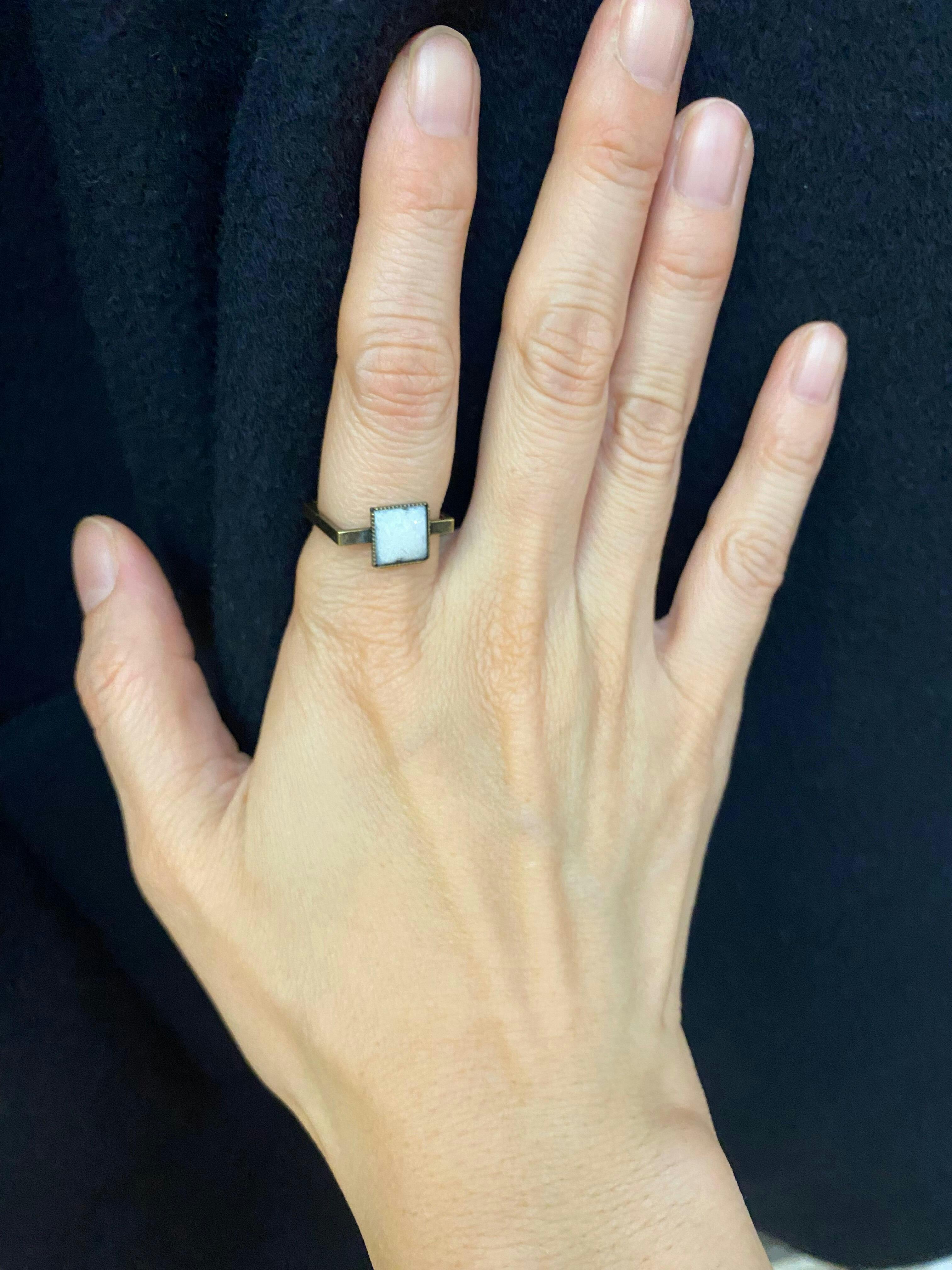 中央に配したスクエアカットのホワイトクォーツが、テクスチャーのある輝きで、静かに指先を照らすスクエアリング。
